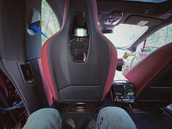 毕竟轴距长达3000mm,后排的空间自然非常享受,再加上纯平的地板,硕大的天幕和简约的布局,进一步增加了这种开扬感,坐在iX的后排不会有任何压抑感。