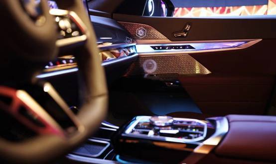 首当其冲的就是萦绕在新7系里面的环抱交互光带设计,虽然它在一定意义上属于氛围灯的范畴,但实际上比氛围灯的感觉高级多了,它以流动的灯光设计来模拟出水晶般的造型,并且还能根据需要进行各种氛围营造或者与你进行互动。