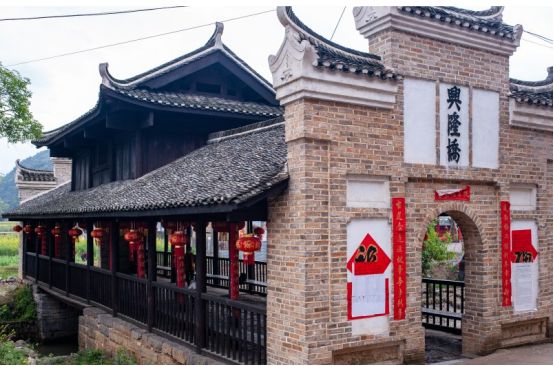 在村子入口的右边,有一座古老的风雨桥横卧在一条小溪上。风雨桥是用木结构建造的,有柱子、横梁和瓷砖。桥的两端都砌了砖,进出都有拱门。拱门上方有一个黑色的复 杂单词"兴隆桥"。