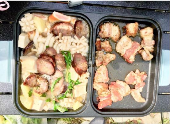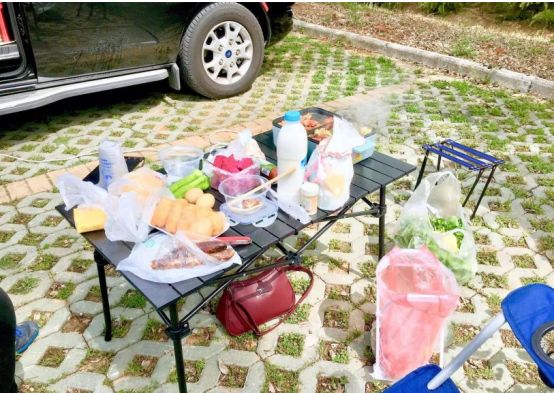 逛了一圈回来 ,邻居正在紧锣密鼓的张罗着野炊的桌椅和食材。下图为记录仪截图,正前方的车就是邻居的车,他的车上工具那才叫一个齐全,自驾游野营野炊的一应俱全。