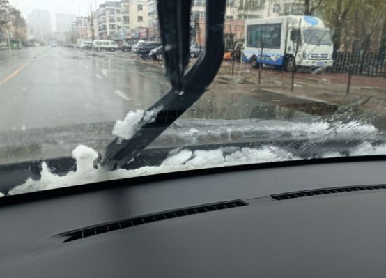 △车窗上全是冰雪,只能用车,上的雨刷器不停地对风档进行擦拭