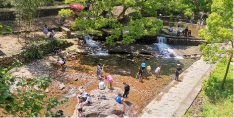 从原路返回时,还停留在山间溪滩中玩耍的妻子依然欢心十足。那清澈溪水,空蒙的山峦,倒挂垂柳,人一旦置身于自然山水之间,没有一人不玩性激起。我也是如此,脱下鞋子,捲起裤子,加入这场人与自然交融欢娱之中了……