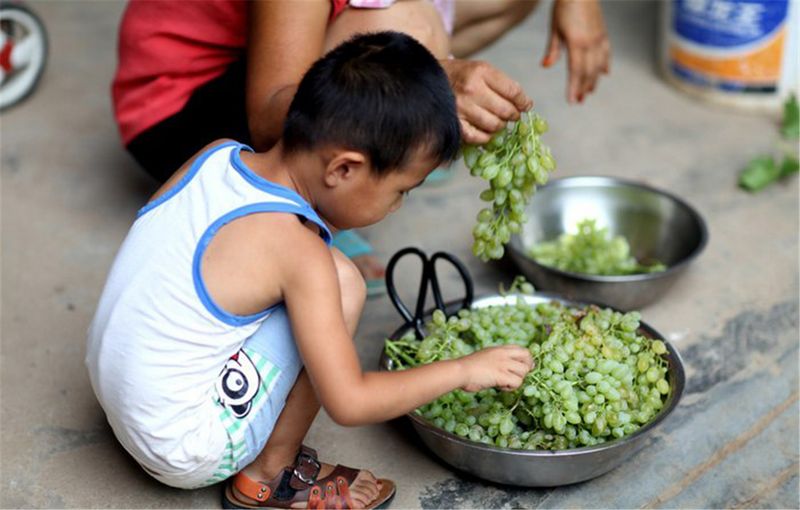 老爸正在给小朋友摘果子。很亲切熟悉的场景,我们小时候都是这么馋。