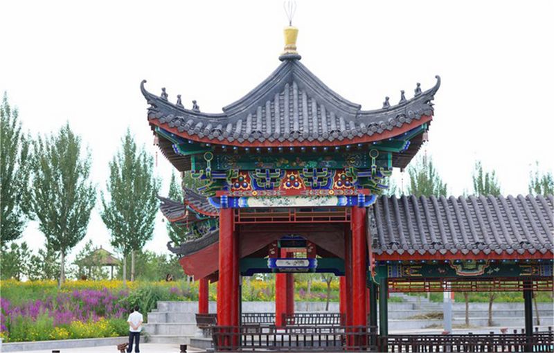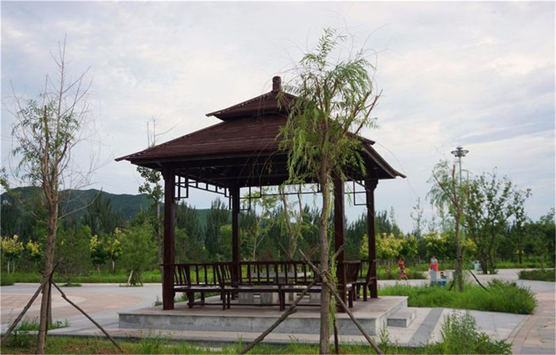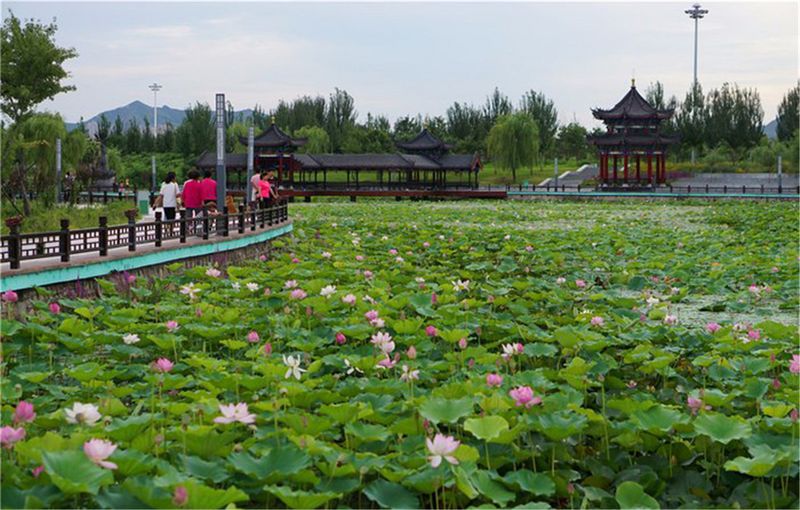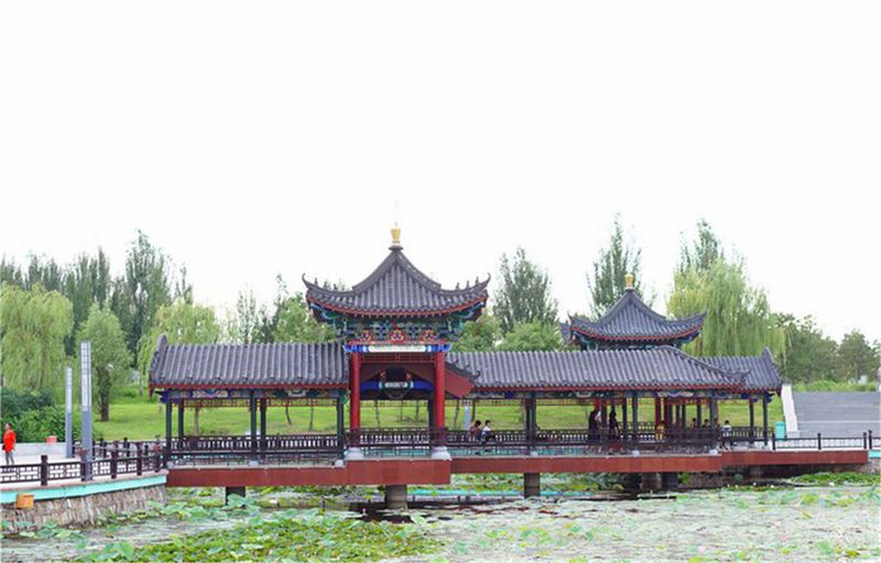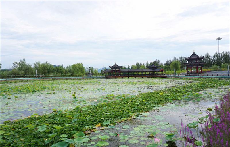 莲池西侧建造了一座凉亭长廊,供游客欣赏休闲。