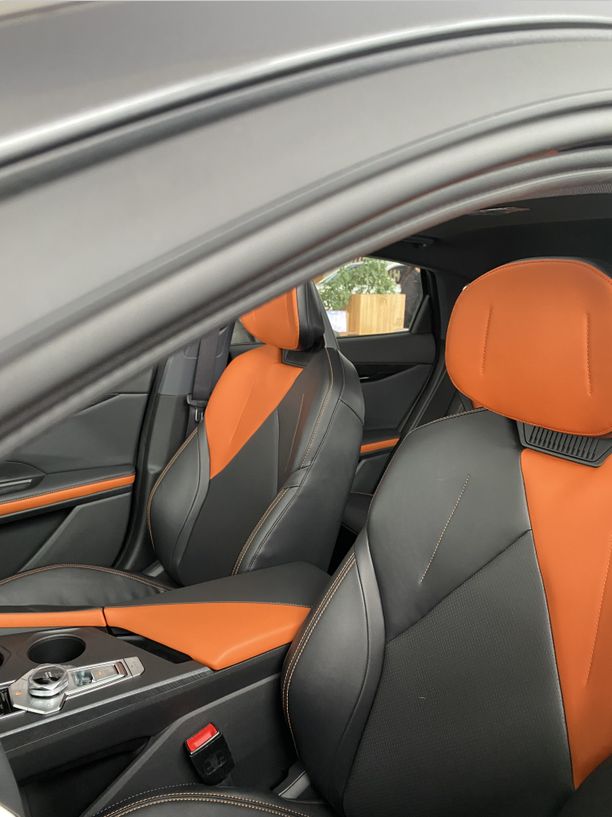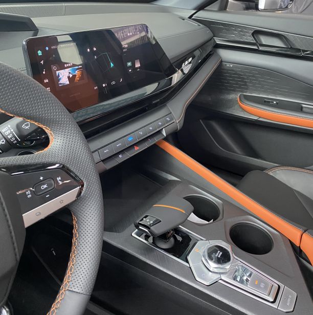 现在我们一起来看看它的内饰部分,iDD基本保持了原有燃油车的那种科技风的内饰风格,主要的不同就是SUPER RACE的按钮,它由原来的橙色变成了亮绿色的设计,凸显出它新能源的身份。而且它的仪表盘上方显示了更多关于电量的一些信息。
