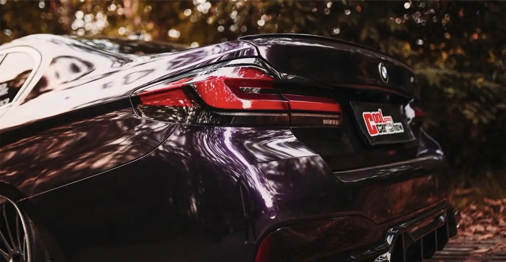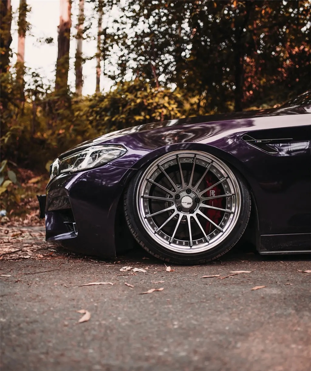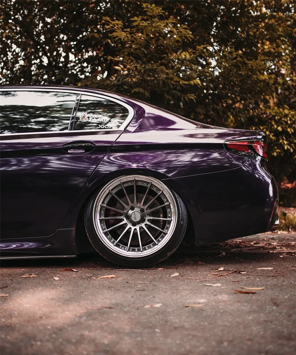 紧接着他对外观进行了升级,为爱车安排了M5车型的引擎盖、包围以及翼子板;外观贴了金属午夜紫色车膜;配备了一套SSR CVO4S轮;还搭配了可调倾角、束角套件,做出了前5.5°、后6.5的倾姿态;原厂前四活塞刹车也被升级为AP8520六活塞刹车......