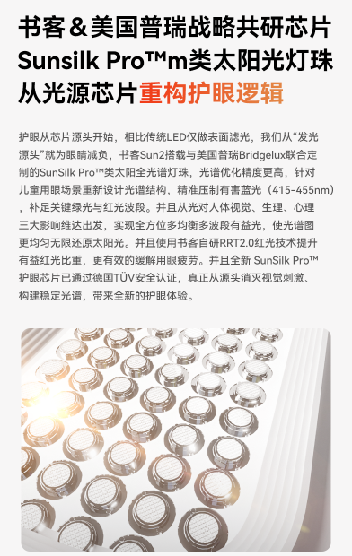 基于这一理念,书客携手美国普瑞Bridgelux,共同定制SunSilkPro™类太阳全光谱灯珠。通过灯珠的光谱优化,书客Sun2在儿童用眼场景出更高的光谱精度,在硬件层面精准压制400–455nm有害蓝光峰值,同时补足关键绿光与红光波段,使光谱更接近自然日光节律。配合书客自研的RRT2.0红光技术,不仅缓解视觉疲劳,还能有效延缓近视发生。此外该芯片已通过德国TÜV权威认证,实现低视觉刺激、稳定光谱,为儿童带来全新的护眼体验。