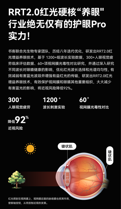 为了更好地养护孩子眼部健康,书客Sun2联合光生物专家团队,基于1200余组波长实验数据和300余例临床评估,研发出RRT2.0红光增益养眼技术。通过优化红光波长选择和光谱均匀性,不仅有效减弱有害蓝光波段,更增强了有益红光的传输,最大限度保护视网膜和眼睛其他重要组织。测试结果显示,该技术可有效降低近视风险达92%,让护眼从被动的防护真正迈入主动的养护阶段,为孩子提供前所未有的用眼保护。