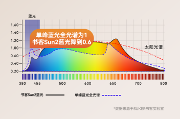 直面这一问题,书客Sun2在低蓝光控制上再次实现了新突破。它通过大幅度削减400–455nm波段有害蓝光的峰值强度,将蓝光抑制效果显著提升了40%。相较于普通的全光谱灯珠,书客Sun2将蓝光含量成功控制在0.6的低水平,达到了RG0豁免级安全标准。这项革新真正实现了从光源芯片层面抑制有害蓝光,让孩子能够在健康柔和的光线下安心学习,也让家长从此无需再为蓝光问题而担忧。