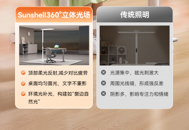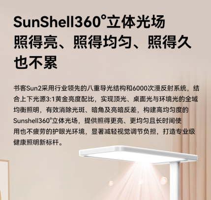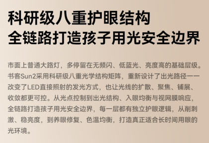 国家卫健委数据显示,2024年我国6–12岁青少年近视率已达58%,且呈低龄化趋势。然而在家庭学习场景中,传统台灯普遍存在“只照亮桌面、不照亮环境”的问题,高亮反差、频闪和蓝光危害成为视疲劳与近视高发的主要原因。书客Sun2正是基于这一痛点出发,从光学结构到光源芯片,从照明逻辑到养眼科技,完成了底层进化,打造出真正适合孩子成长的专业级护眼光环境。