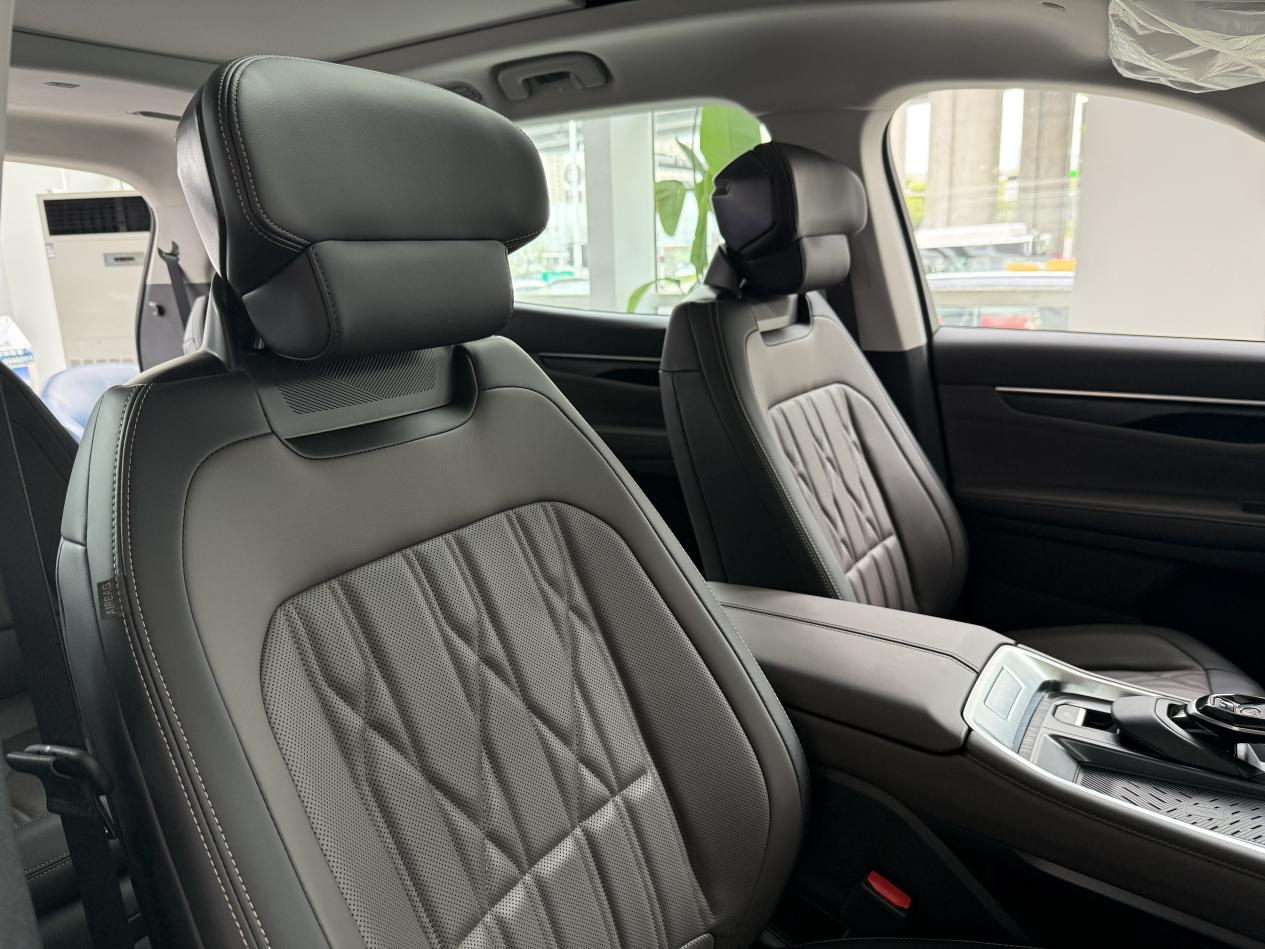销售特意强调:顶配的旗舰座椅用的是半苯胺皮质,和劳斯莱斯、宾利同款材质。我也去感受了一下,摸了摸,手感确实细腻柔软,坐上去包裹性也很好。果然,一分钱一分货,没有花钱的不是。不过感觉至尊的黑棕色内饰也挺有质感的,比起之前看的日系,豪华感还是做得更到位。
