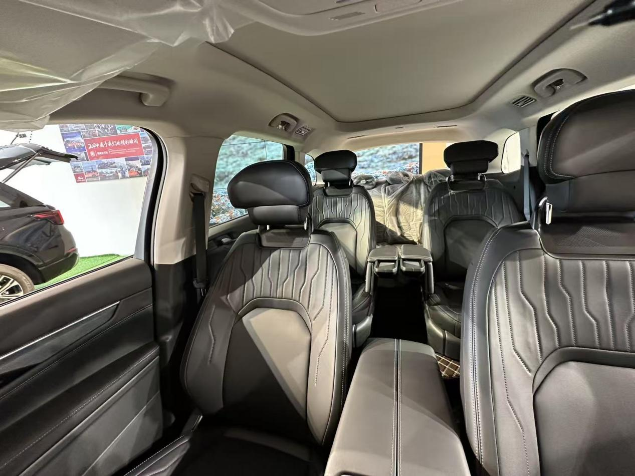 我特意去第三排试了试,以我1米75的身高,在第二排留有一拳腿部空间的情况下,坐到第三排,膝盖刚好顶到第二排椅背,但还不至于特别憋屈,短途应急或者坐小孩是完全没问题的。比很多同尺寸但采用232布局的SUV的第三排要实用得多。销售小哥说顶配旗舰型的第二排座椅更奢华,用的是和某些百万豪车同款的半苯胺真皮,我们过去摸了摸,确实手感更细腻柔软,不过考虑到预算,至尊版的皮质已经相当不错了。