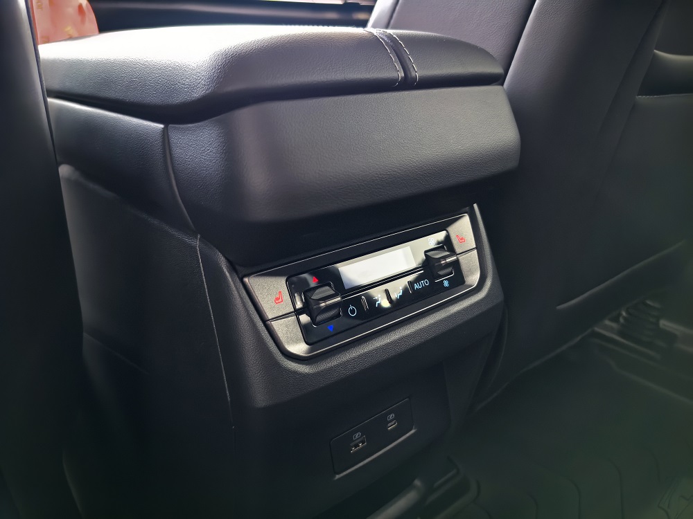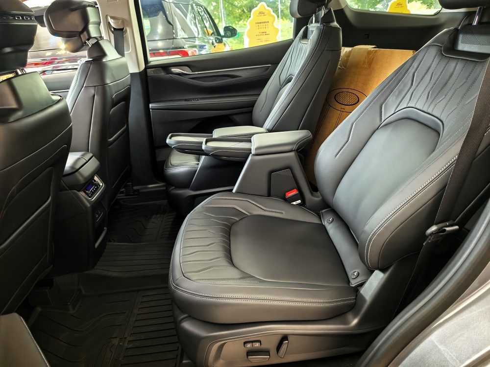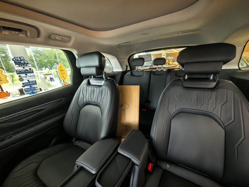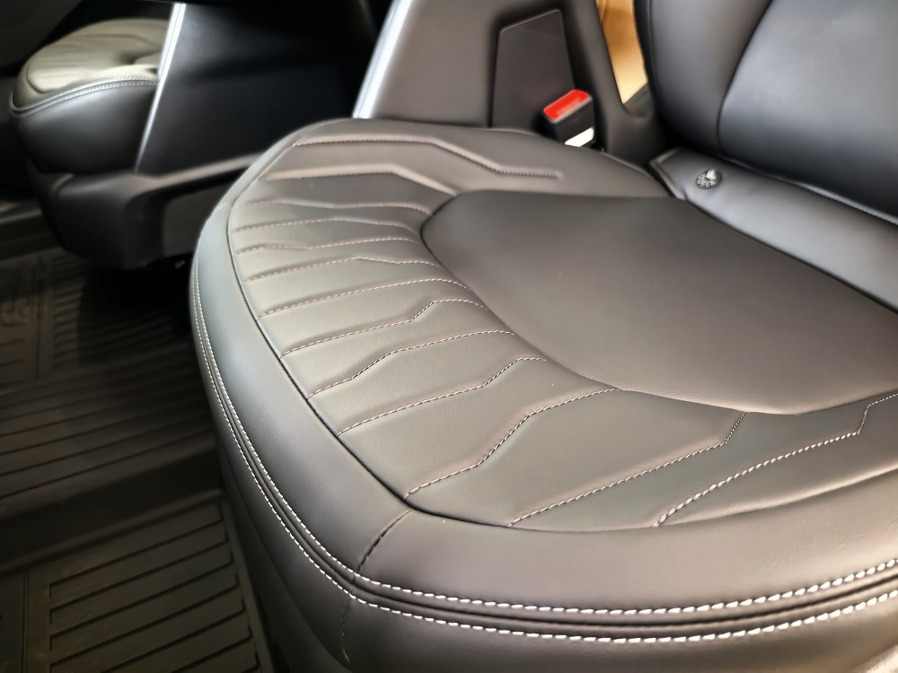 二排算是很打动我的一个点,2-2-3 布局很香,中间过道宽得很,从二排走到第三排毫不费劲。座椅是皮的,触感软乎乎的,第二排还带加热功能,过几天降温后,带老婆老妈出门,后排坐着就不担心冻屁股了。