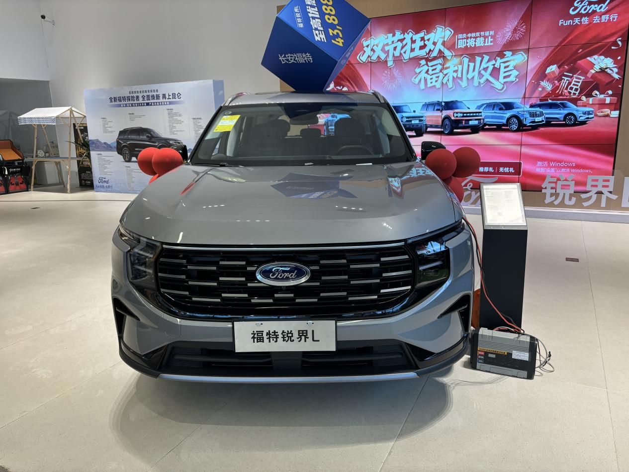 一进店,门口就停着一台26款锐界L,是燃油版的二驱豪华型(销售说是走量车型)。实车比图片上看着更显大,前脸那种大尺寸熏黑中网挺有气势,分体式大灯也挺精神。说实话,这几年福特的设计年轻了不少,不像老款那么粗犷,多了点精致感。