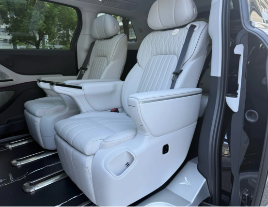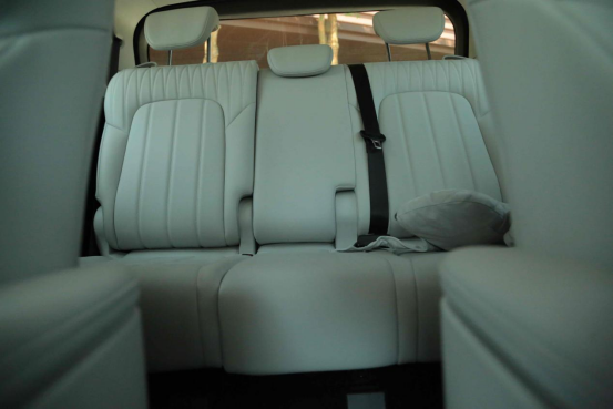 它的产品重点在“移动会客厅”上,说的就是第二排,这里是商务接待和家庭出行的核心,首先是高级打孔真皮座椅,与身体接触的椅面有菱形格纹的处理,看上去很高级,乘坐感也舒适。
