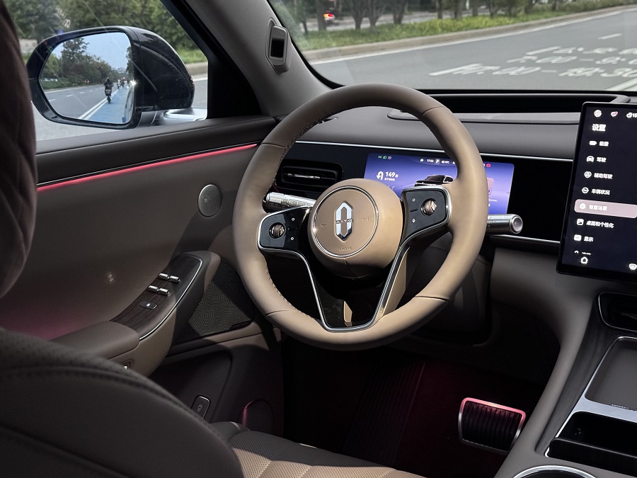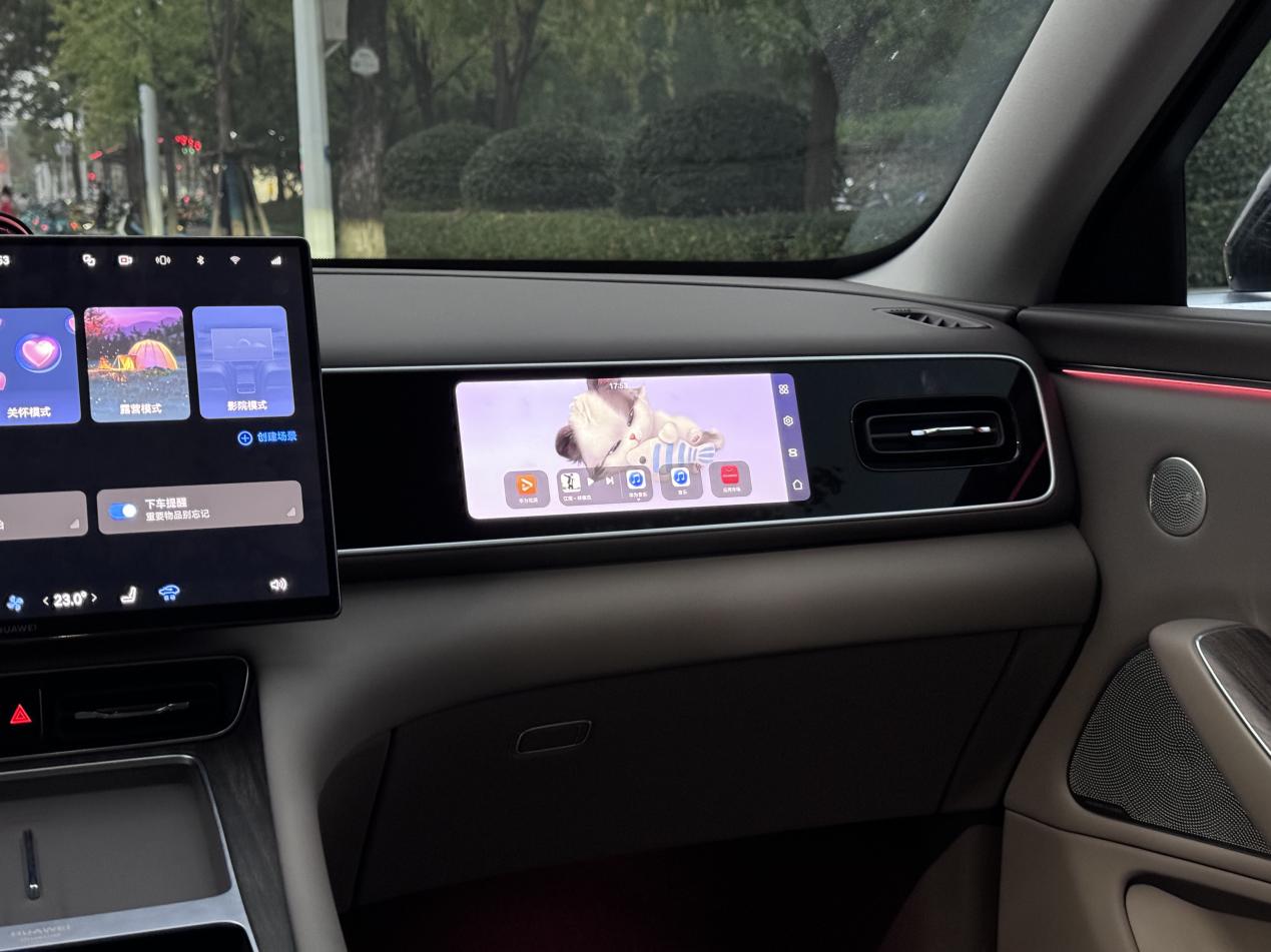 坐进车里最吸睛的就是中控大屏,看起来像家里挂的悬浮电视。导航地图显示特别清晰,路口放大图连小路都能看清,我这种路痴终于不用边开车边眯眼睛找路了。副驾屏是我老婆的最爱,她上班通勤路上追剧,我开车导航,两不干扰。偶尔她看到好玩的视频,三指一滑就能传到我屏幕上分享,蛮有意思的。