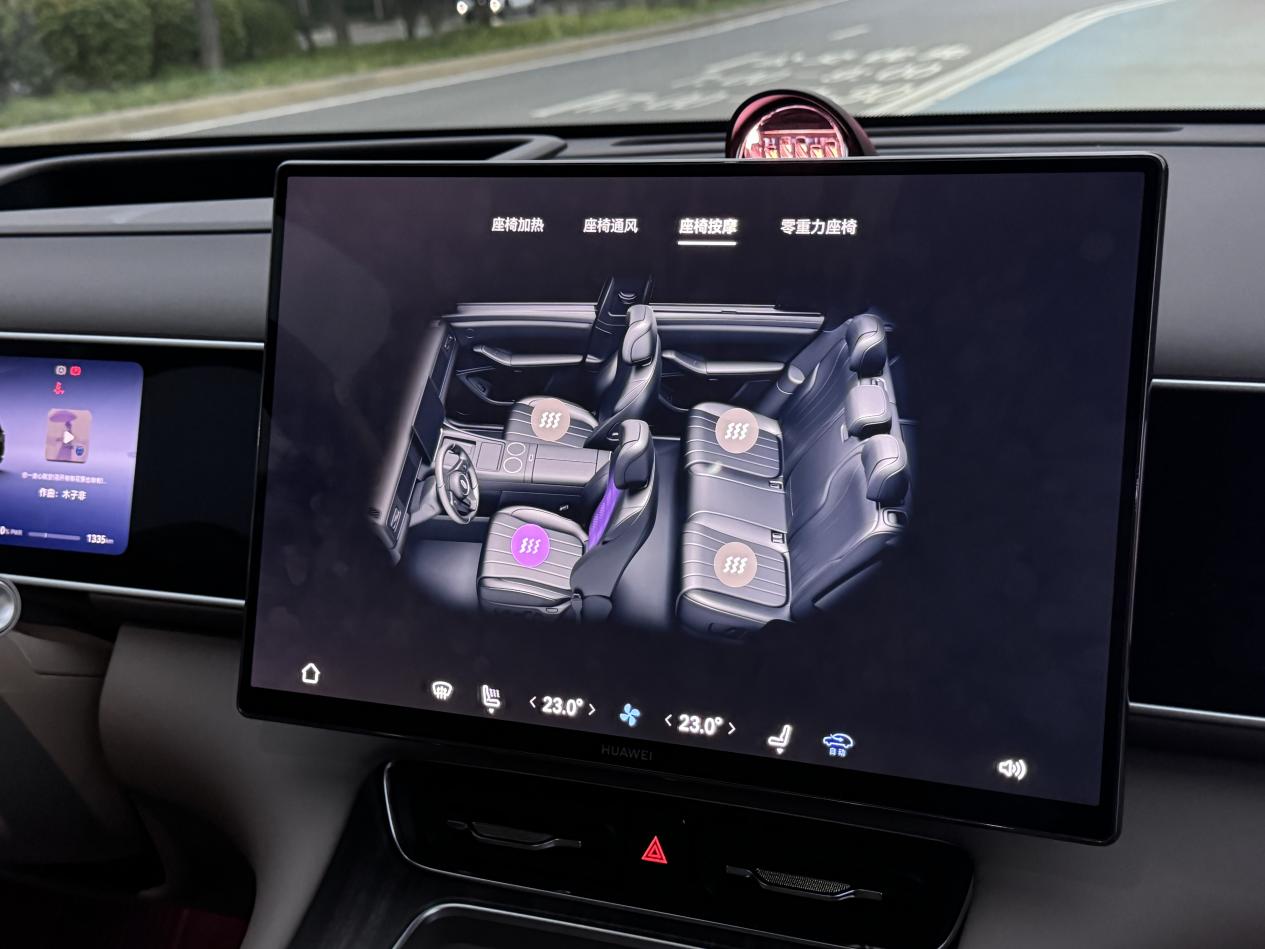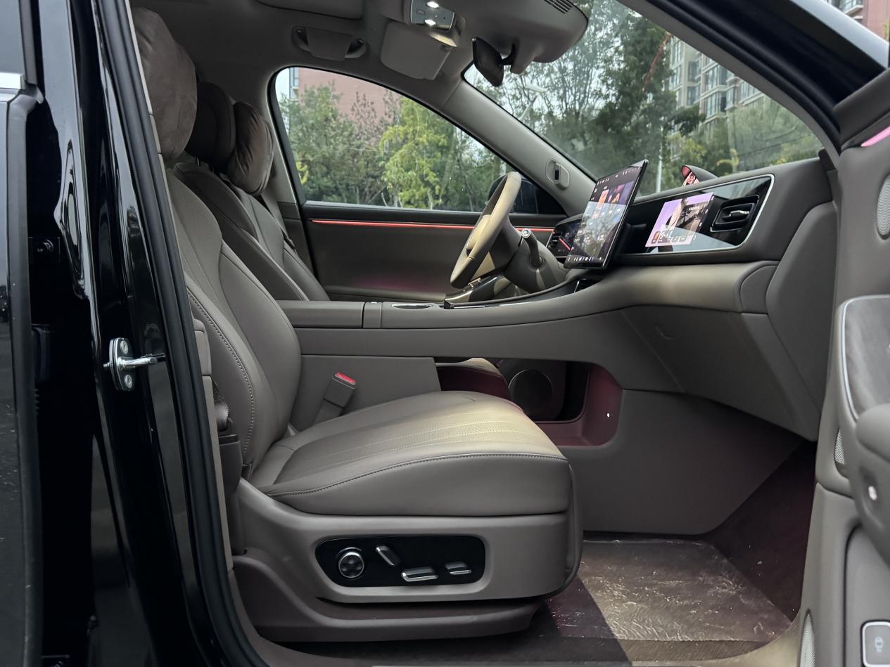 前排零重力座椅(选配)是我午休的宝藏功能。停车时座椅自动后仰,腿托升起,整个人像飘着一样,腰不会悬空。偶尔加班到深夜,在车上躺20分钟就能缓过劲来。副驾座椅也能调节到接近平躺,而且按摩、通风、加热这些都有,老婆说它按摩力度控制得很好,不像有些车型按得生疼。