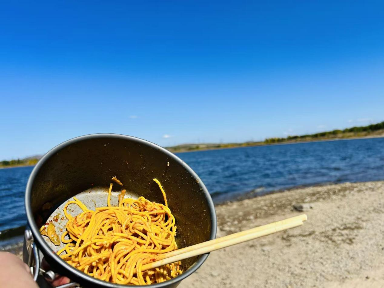 我这次主打的就是一个边走边停,不赶路,静下心来欣赏路途中的风景,所以我自己带了一套简单的露营装备,遇到好看的风景,我会停下车来拍拍照,或者在露营椅上坐着吹一阵风,饿了就给自己煮一碗面,面的香味在旷野散开来,此刻感觉这面比任何山珍海味都香。