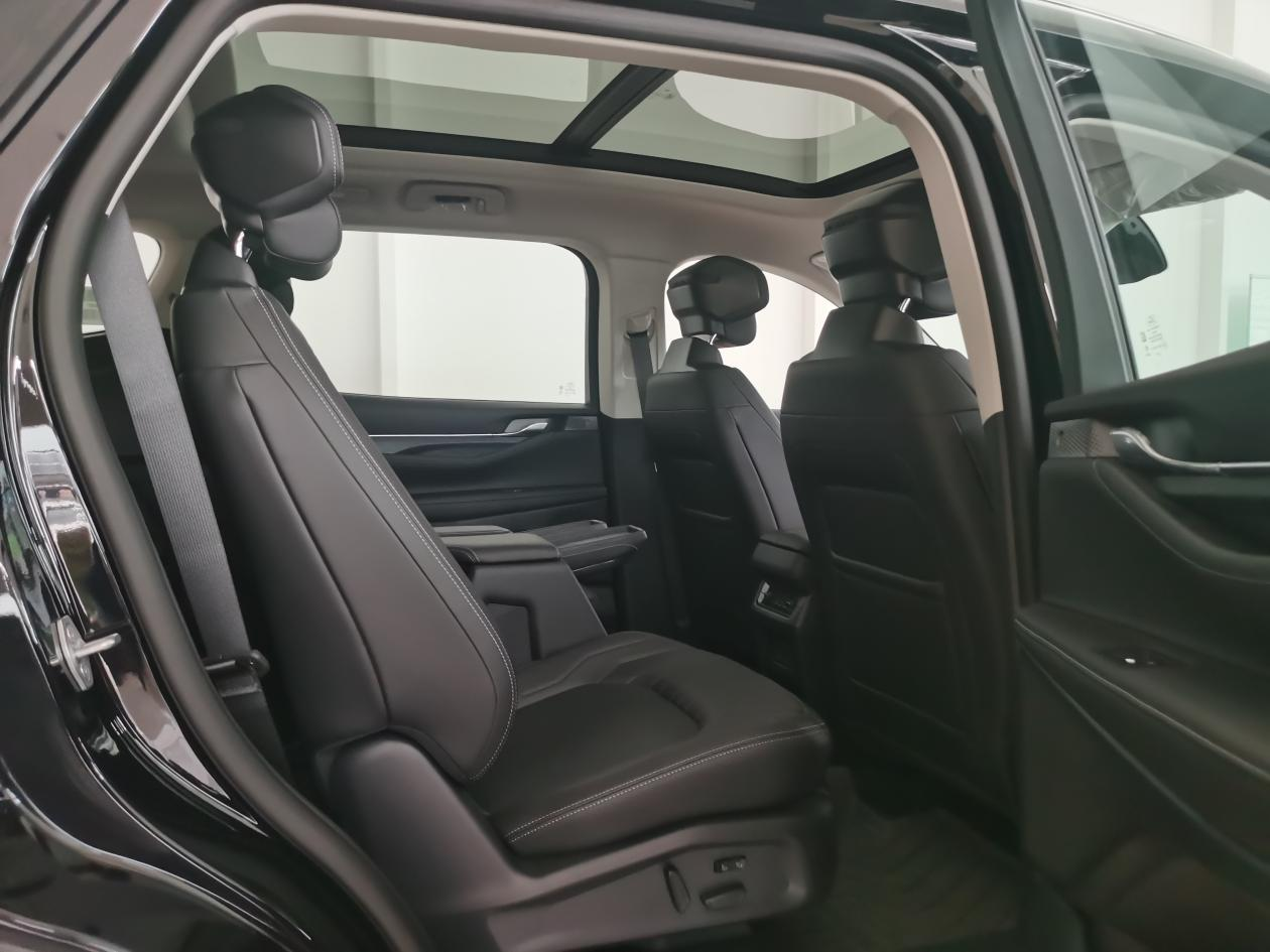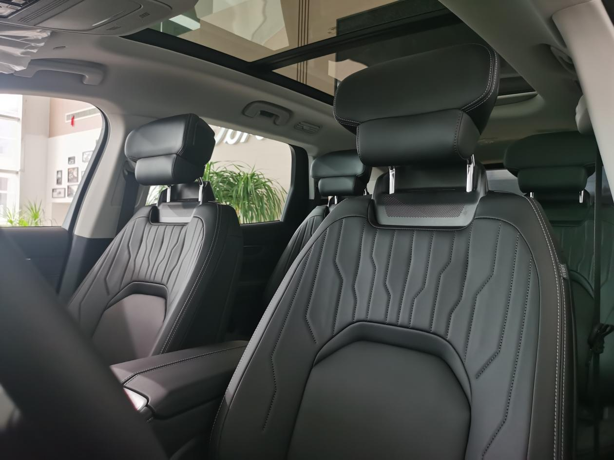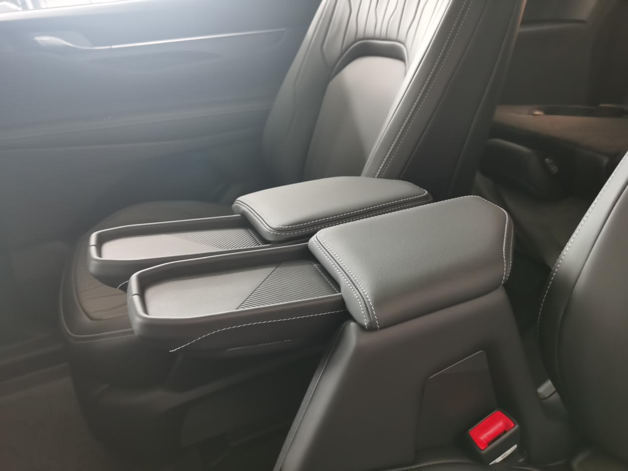 进去坐坐,空间是真心宽敞。我试的这款是2+2+3的布局,第二排两个独立座椅,带加热功能,地面几乎是纯平的,中间通道挺宽,进出第三排不费劲。我身高178,第二排调到最后,腿部能轻松翘个二郎腿,头部也有一拳多的空间。第三排比想象中实用,不是那种“应急专用”的憋屈座,短途坐成年人没问题,但长途的话还是更适合孩子。