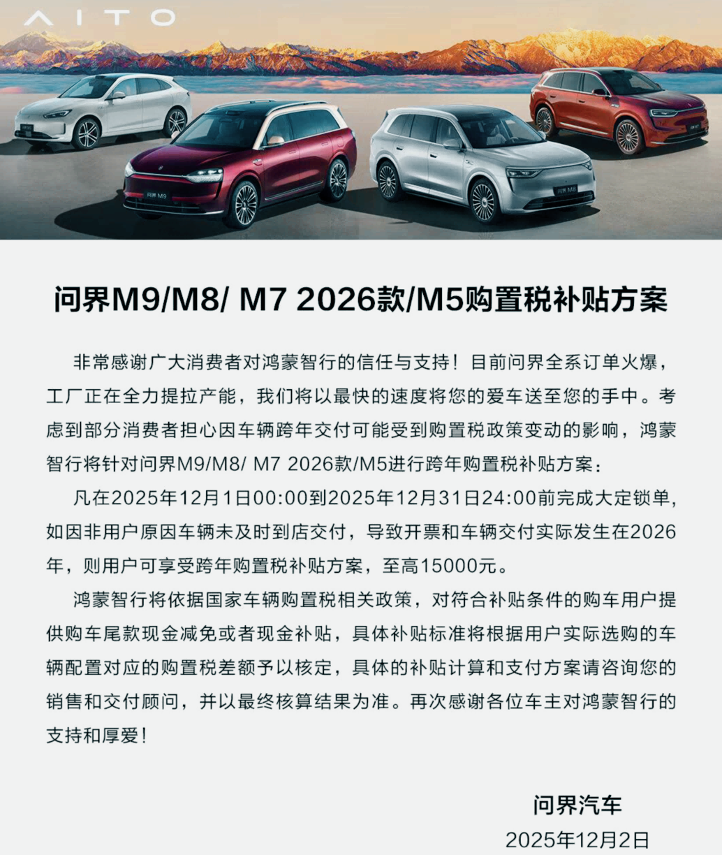 我看到有很多宝妈在关心明年的购置税政策。这两天刷AITO APP,看到问界也针对这个需求做出了应对:12月锁单要是交付慢到明年,就能享受跨年购置税补贴方案,最高一万五。还没下手的宝妈可以趁这波机会去试试问界M7。