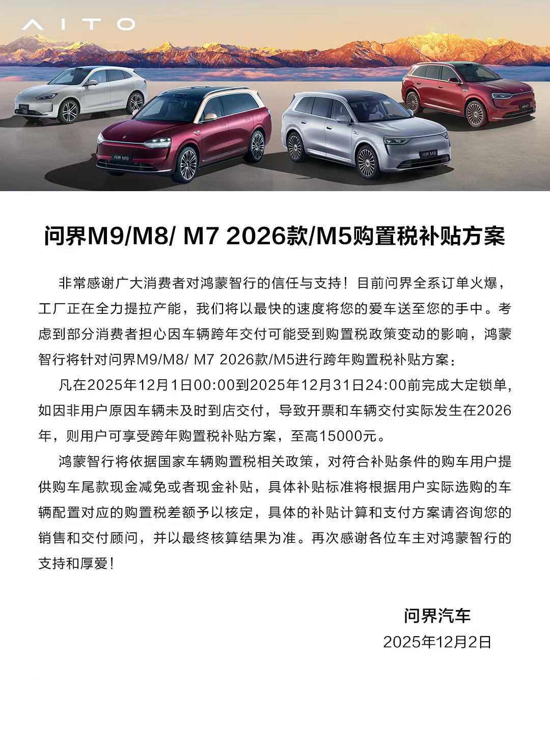 最后得跟还在犹豫的朋友说个实在话,赛力斯工厂那边现在正在加班加点生产,全力以赴保交付,根本不用担心等车问题。最重要的是,借着购置税补贴,现在买能比明年省下大概1.5万的真金白银。这笔钱拿来干啥不好?给家里添置点大件或者全家出去旅游一趟都够了。所以如果你也是刚需,真的建议赶紧冲,早买早享受,别等到明年多掏钱的时候再拍大腿。