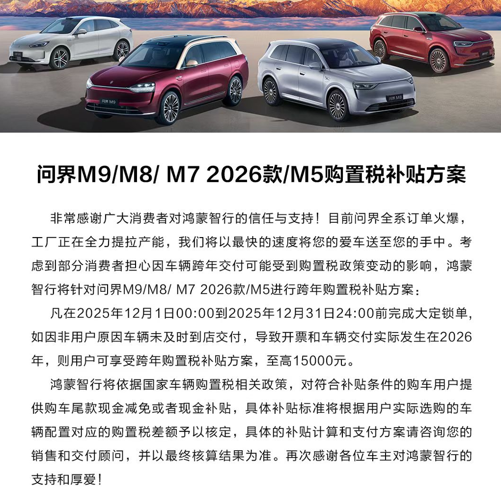 表弟挺喜欢,但纠结现在订车会等很久,也担心万一拖到明年,购置税政策变了咋整。我乐了,直接给他看问界最新购置税补贴政策:年底前订上,如果真因为交车拖到明年,能享受跨年购置税补贴方案,最高一万五。他这一看心里就踏实了,很快就下了单。