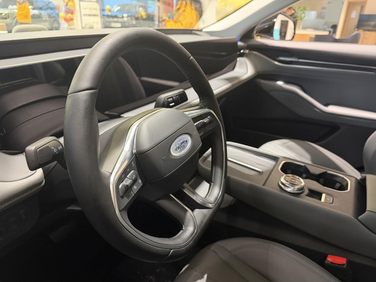 方向盘还是熟悉的平底设计,握感依旧扎实,但新蒙迪欧的控制台是悬浮式的,这点也是和很多电车相似了,增加了下面的储物空间。