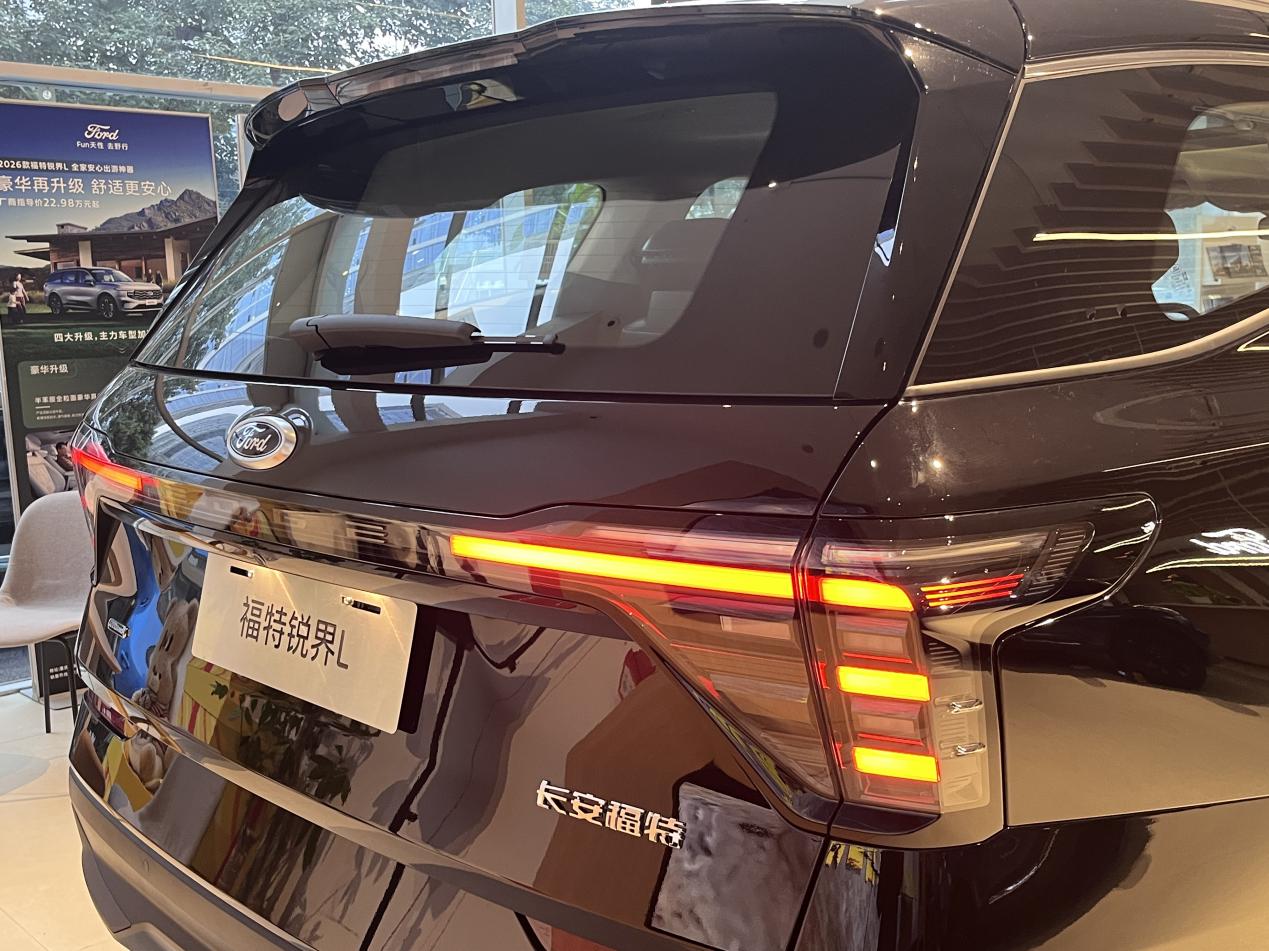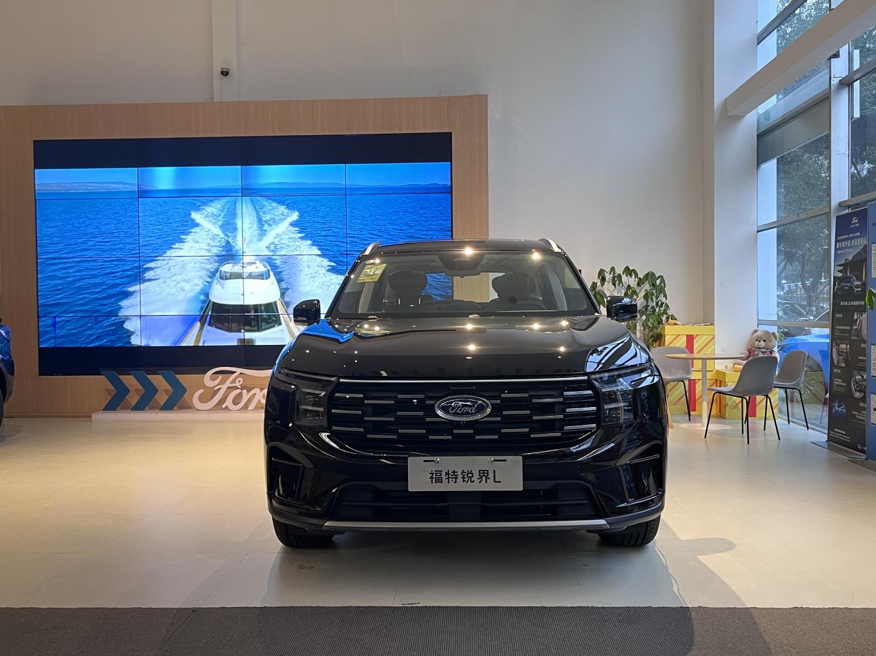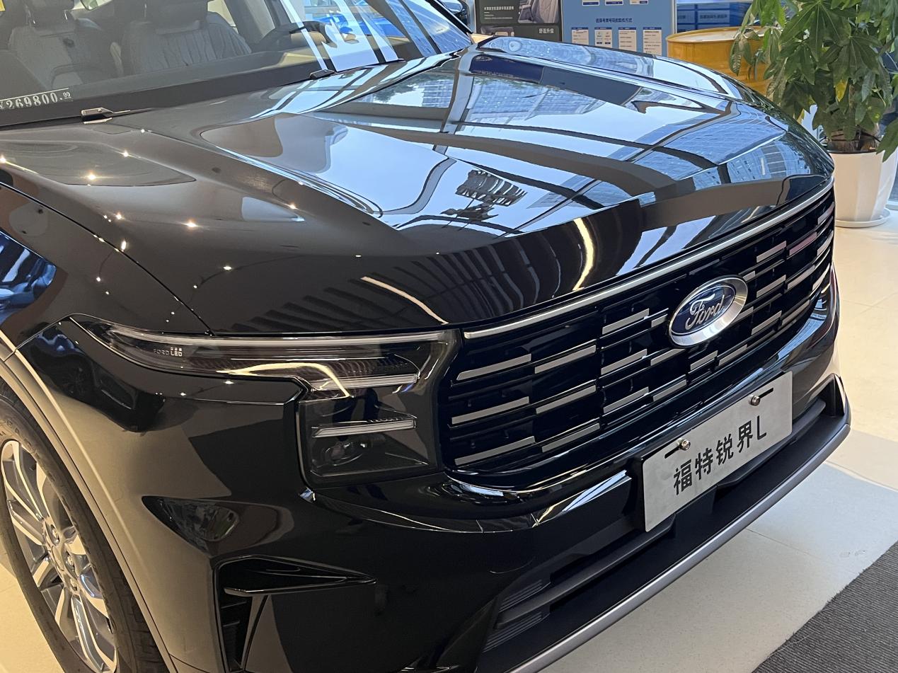 一进店里,锐界L就摆在挺显眼的位置,我们看的是黑色款。第一眼感觉就是这车真大,而且这个黑色漆面挺亮堂的,不是那种乌突突的黑,看着挺精神,也挺大气。前脸那个格栅设计有点新能源车的感觉,比较时尚,不像有些传统SUV那么老气。我媳妇也说,样子不错,比图片上看着更有质感。绕车转了下,美系车那种厚重感从外观上就能感觉到一些,线条比较有力量感,不是那种轻飘飘的造型。