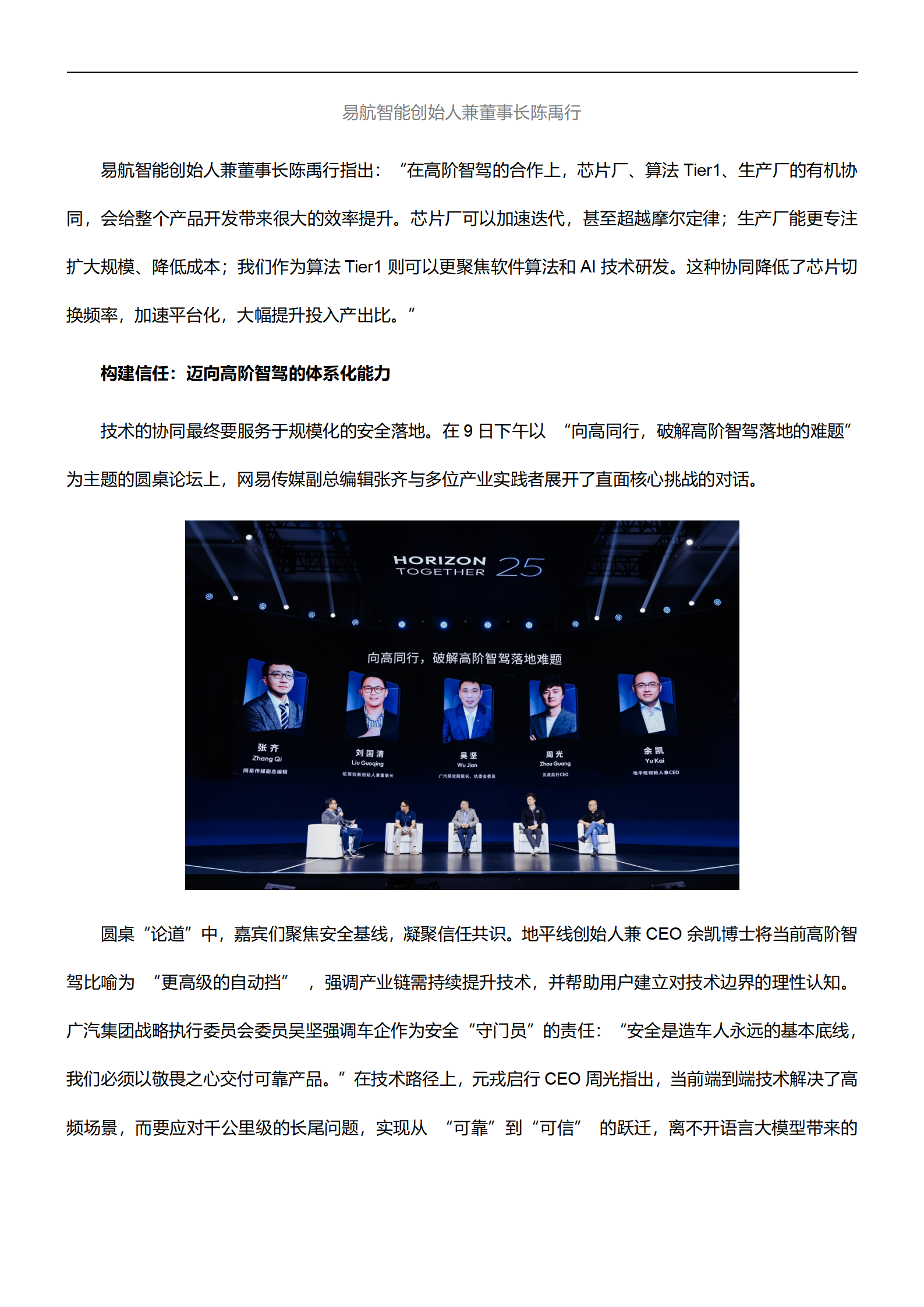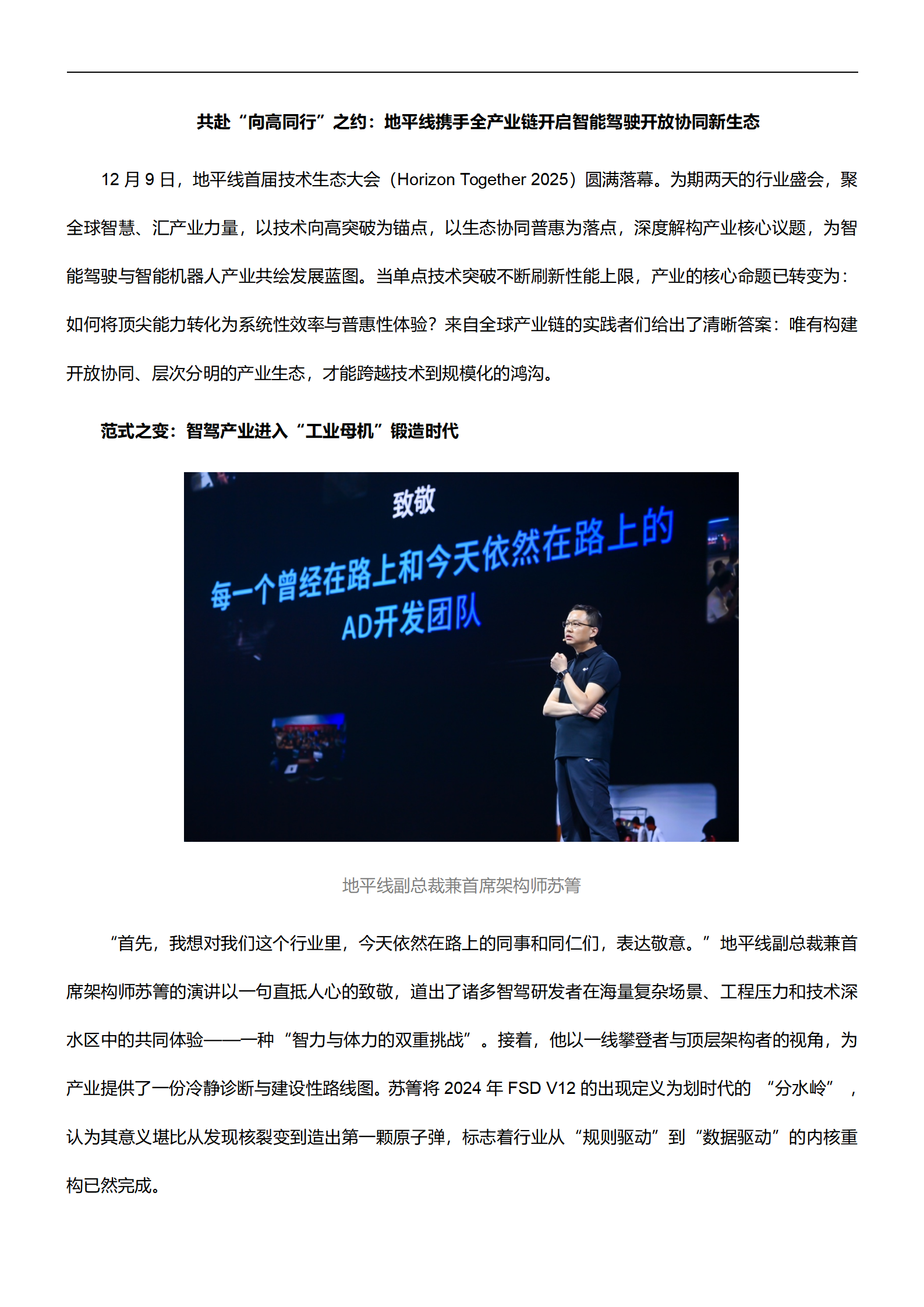 地平线首届技术生态大会的帷幕已落,但协同开放的产业之路才刚刚启程。正如余凯在闭幕致辞中所展望:“我们赋予机器智能,最终目的不是让机器更伟大,而是让人类更自由。”于智驾而言,当驾驶成为一种选择、而非负担,人们的时间与心力将得到解放。“给每一位美好的祝福,让我们来年可以有更加精彩的、推动全行业科技的进步。”余凯的致辞,为大会点亮了一个温情脉脉的结尾。
