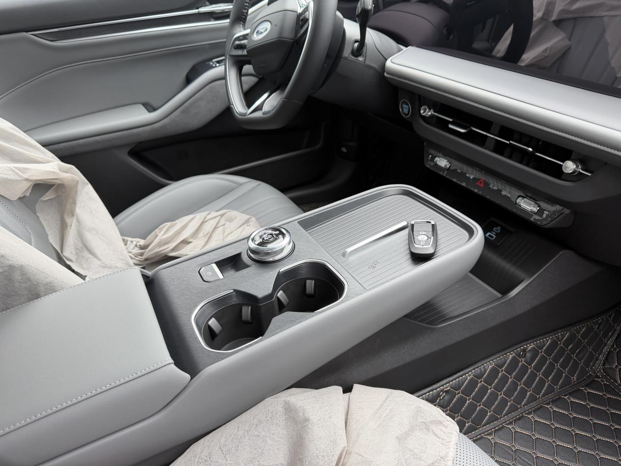 内饰有就是这个中控的地方有点改变,如图所示,下方多了一个放东西的地方,上面是50w的无线充。但整体的内饰质感还是一般般。车机提升挺大的,毕竟换了8155芯片,启动开机,还有打开应用这些反应都比较快,能够赶上同级新能源车的水平了。