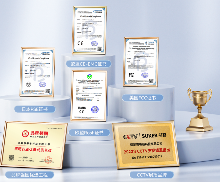 书客品牌深耕家用深度护眼领域已逾10年,凭借雄厚的技术积累与持续创新精神,自主研发出一系列行业领先的核心技术,专注攻克长期困扰家庭的光线照度与护眼难题。书客始终秉承“医学养护眼”的使命,坚持以高标准科研理念为指导,从技术突破到产品落地,必须经过3200+小时实验室护眼模型训练、58项光健康干预测试,90%以上儿童用光行为场景模拟等100余道严苛工序的逐一打磨。并还邀请了20000+家庭测试使用,实时发现真实发生的安全隐患与问题并改进,打造高效、持久、可信赖的家居健康解决方案,为全球消费者构筑起真正安心的健康屏障,同时书客还荣获6家全球专业机构的检测认证,下图为suker书客品牌各种权威机构认证图: