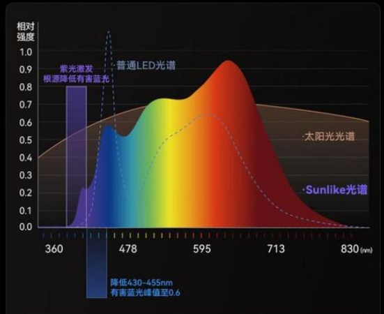 传统蓝光激发技术的LED灯,由于光谱不均衡,蓝光成分偏强,红光、绿光不足,导致色彩失真。长期使用这样的光源,眼睛需要不断调整对比度来适应不均衡的光谱,从而加重视疲劳。而紫光激发(410-420nm)技术避免了450nm高能蓝光的峰值,有效减少蓝光对眼睛的伤害,降低视觉疲劳,并且能够提供更加均衡的光谱。
