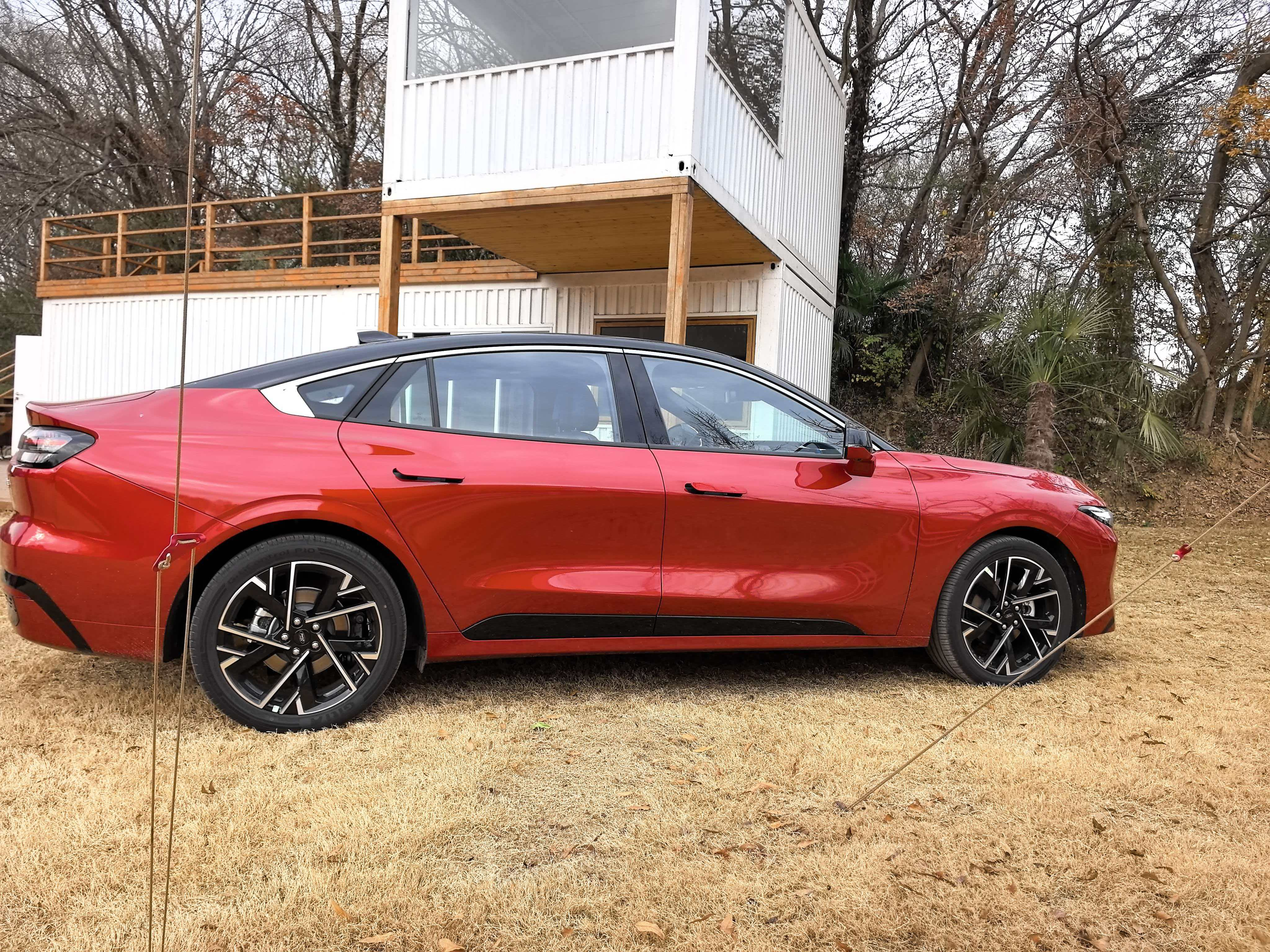 这车的外观运动感很强,我试的这台是渔火红的颜色,开在路上确实挺醒目。仔细看,它的车漆质感很厚实,用料显得很足。说到车身安全,我看过中保研的碰撞测试报告,蒙迪欧核心三项都是优秀,关键部位用了高强度钢材,这让我觉得挺放心。