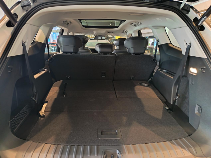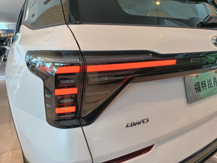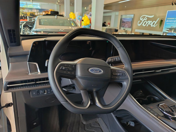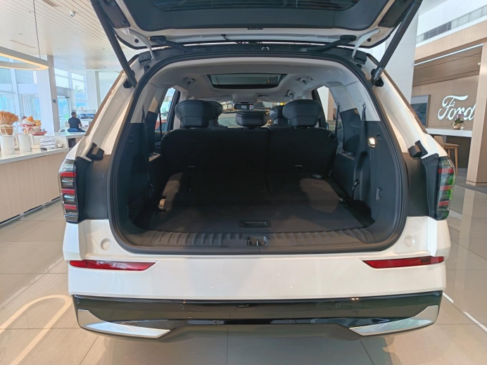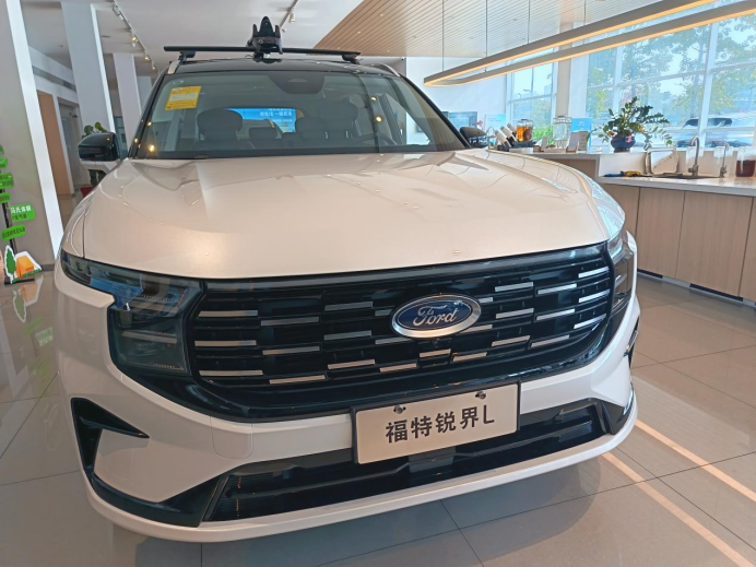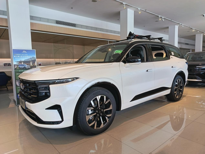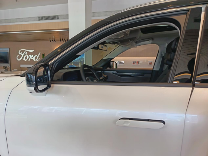 上周末没什么事,带着全家一起去福特店里转了转。展厅里摆的是一台燃油的四驱至尊版,颜色是我比较爱的白色,看起来挺稳重。第一眼感觉这车真挺大的,车头方正,线条也硬朗,不难看。销售说是燃油的顶配,但店里也有混动版可以选。我最关心的当然是座位。