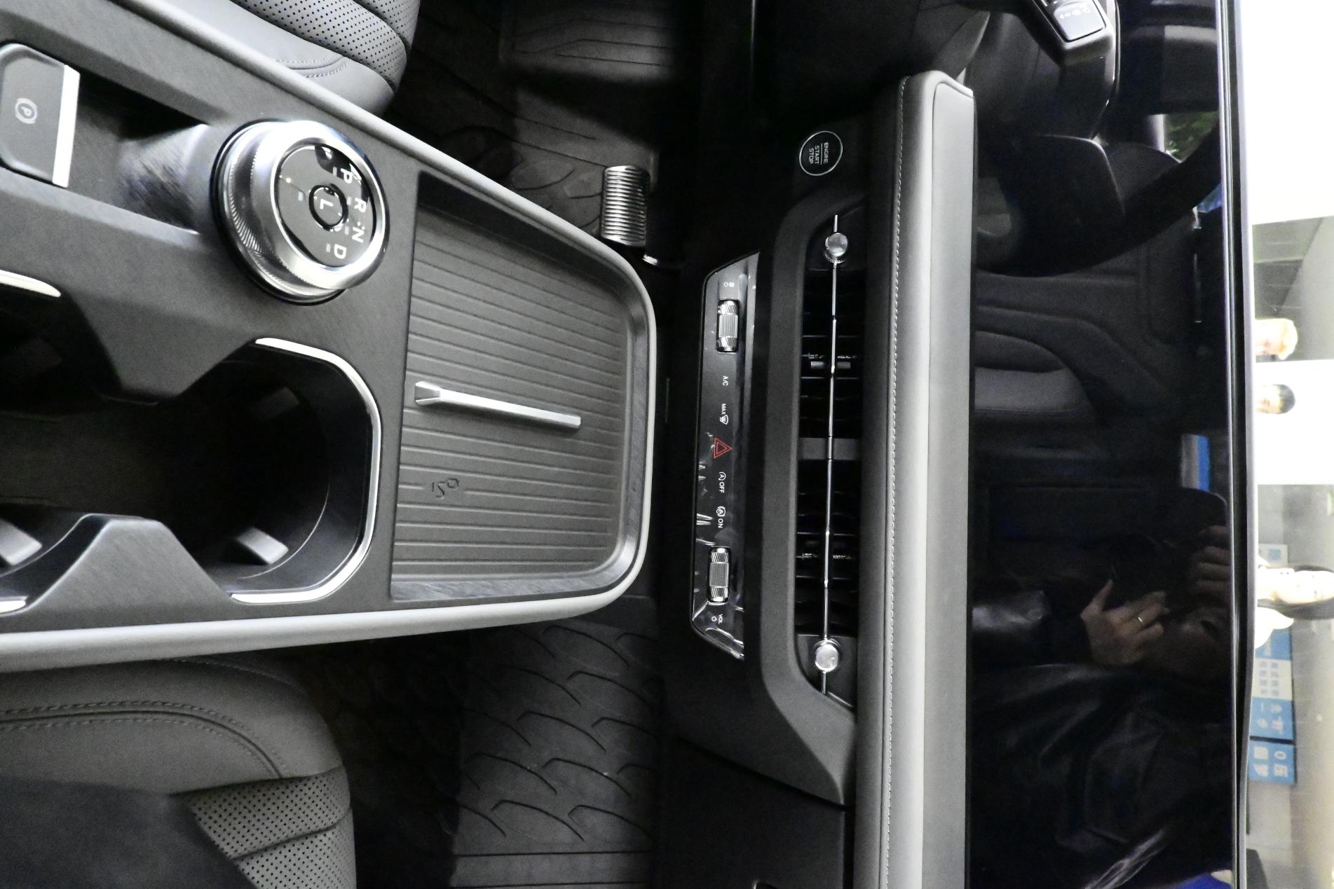 内饰的科技感也很惊艳,1.1米的双联屏直接贯穿中控台,植入8155芯片,清晰度和流畅度都不错,用手划了几下没出现卡顿的情况,空调控制、导航这些功能都集成在屏幕里,操作起来很方便。