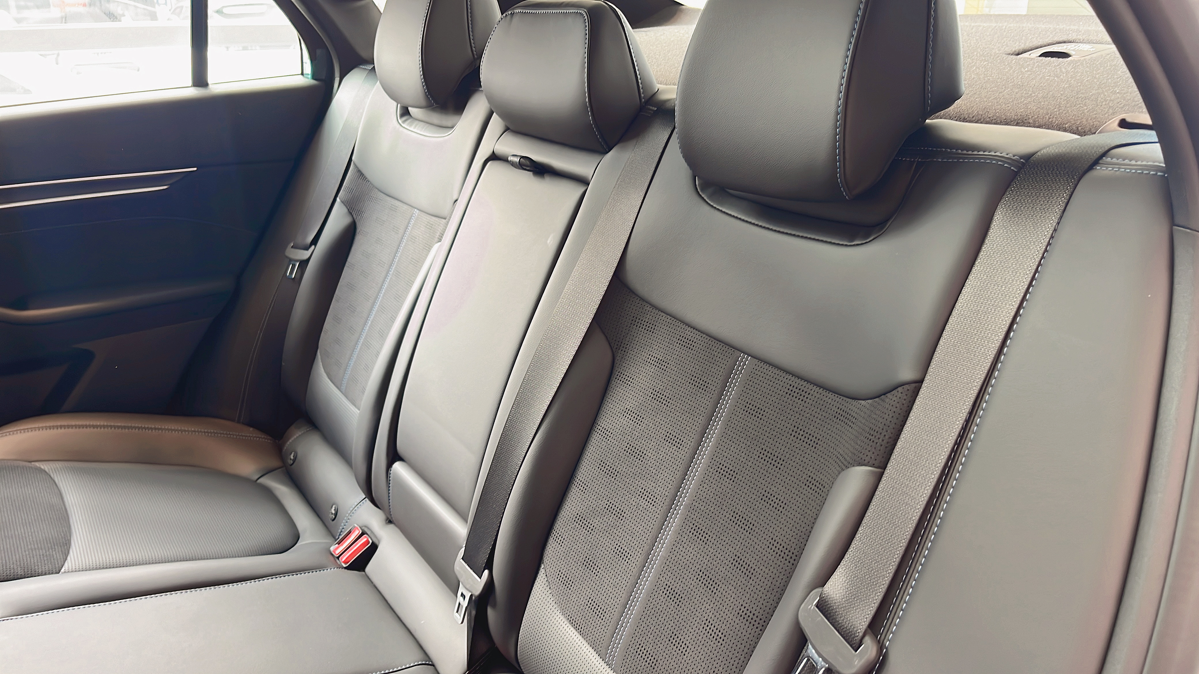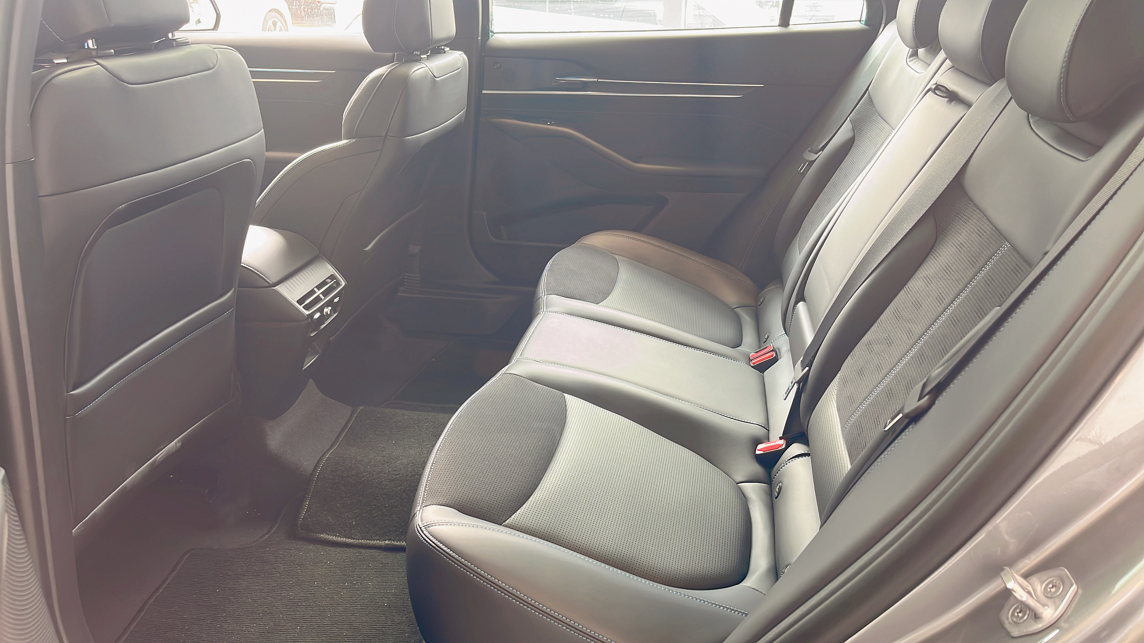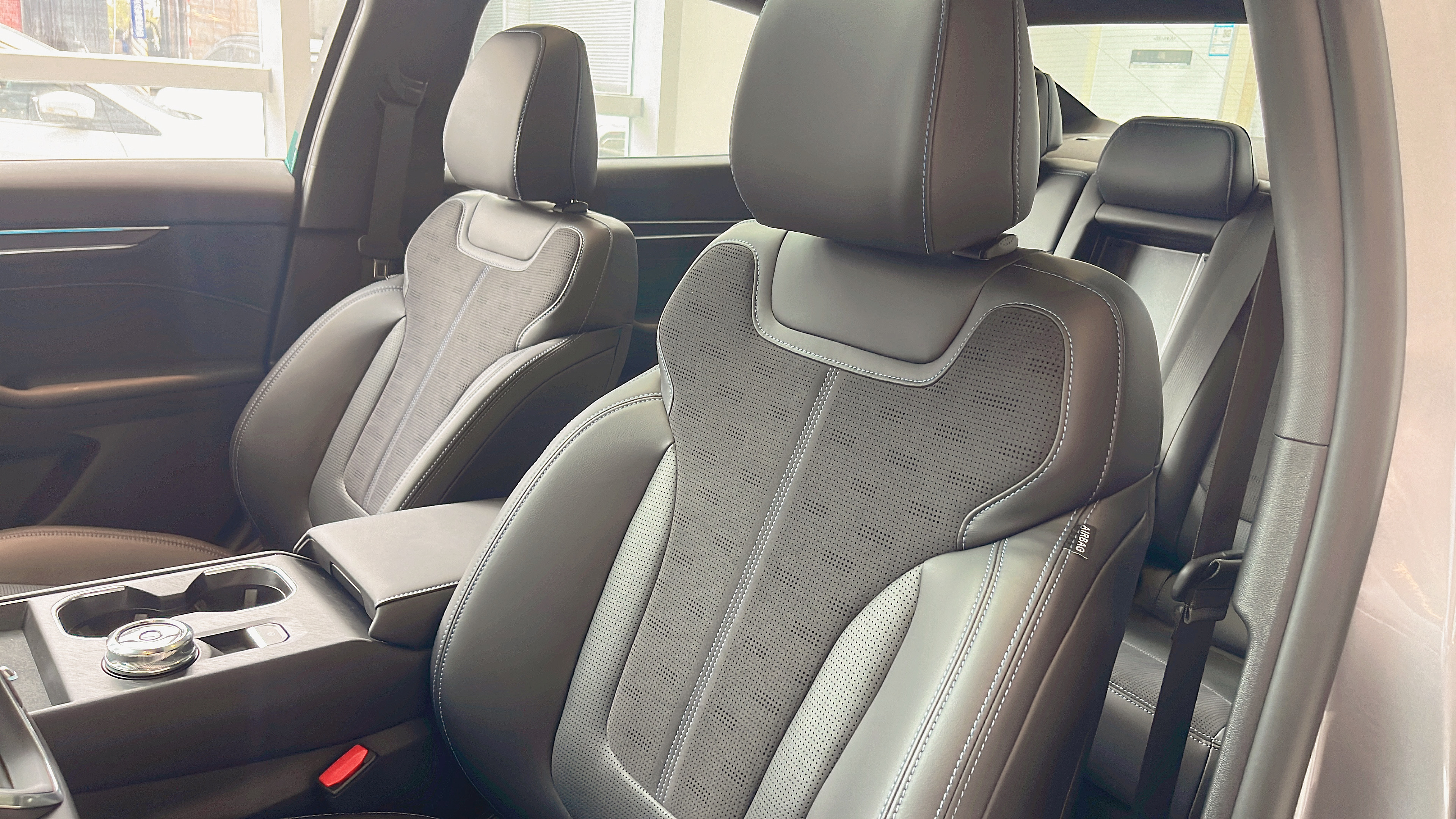 座椅是仿皮材质,触感比想象中细腻,填充厚度刚好 —— 不会软塌塌没支撑,也不会硬得硌腰。我 175cm 的身高,前排调好坐姿后头部还有一拳余量,视野很开阔。