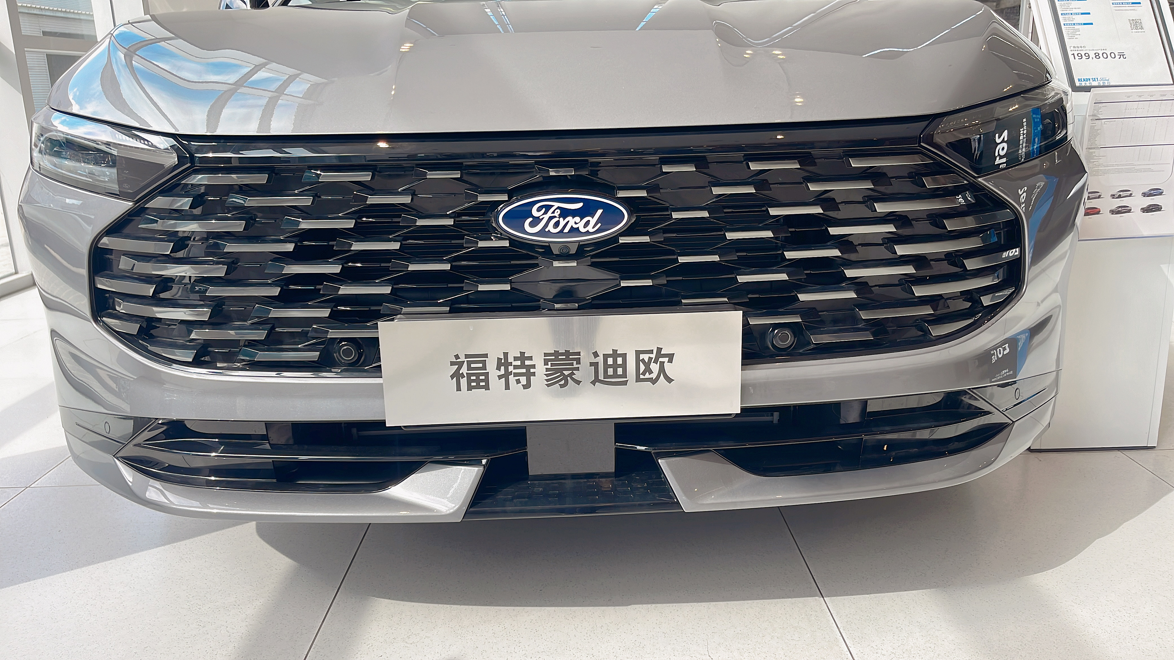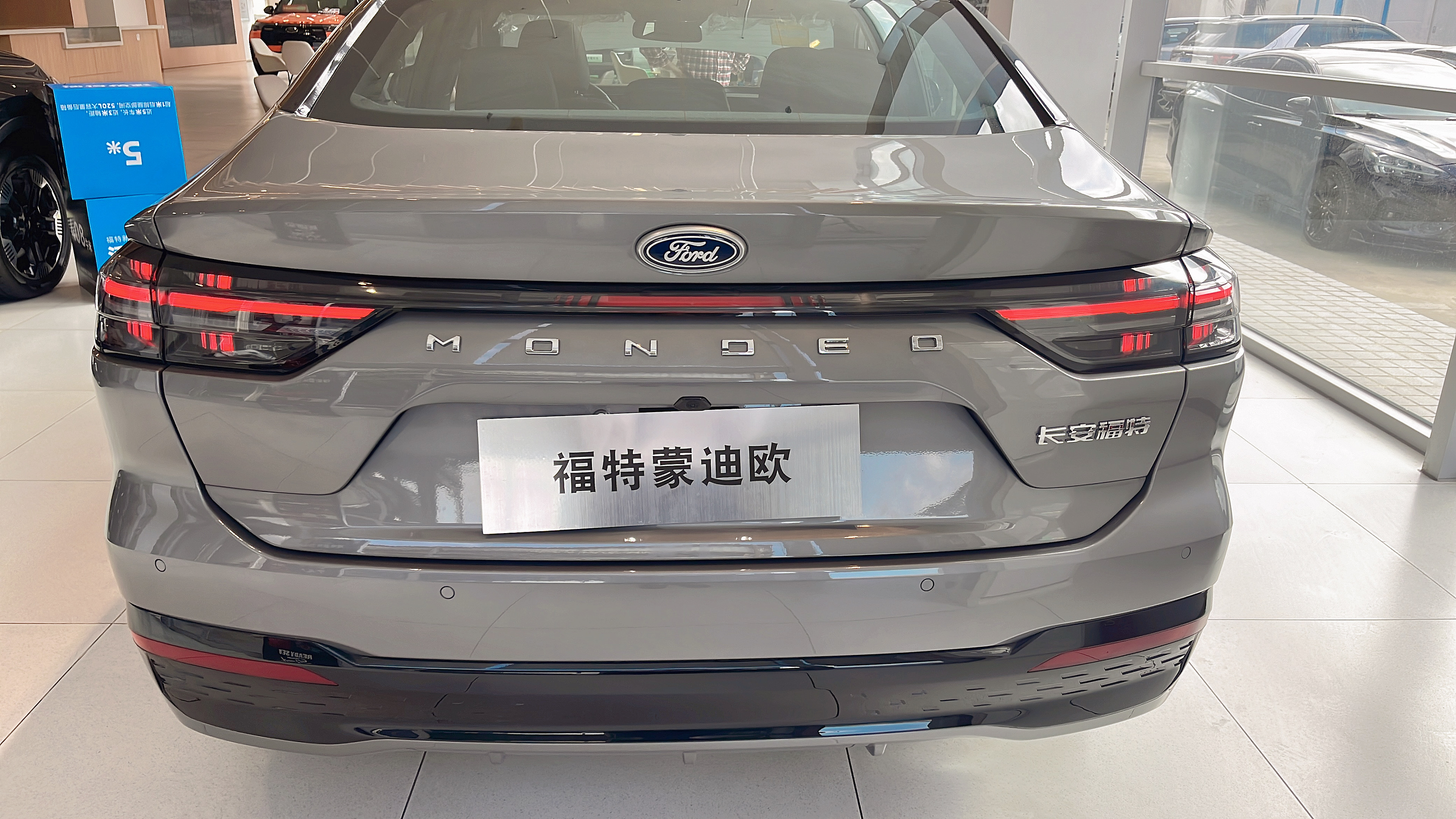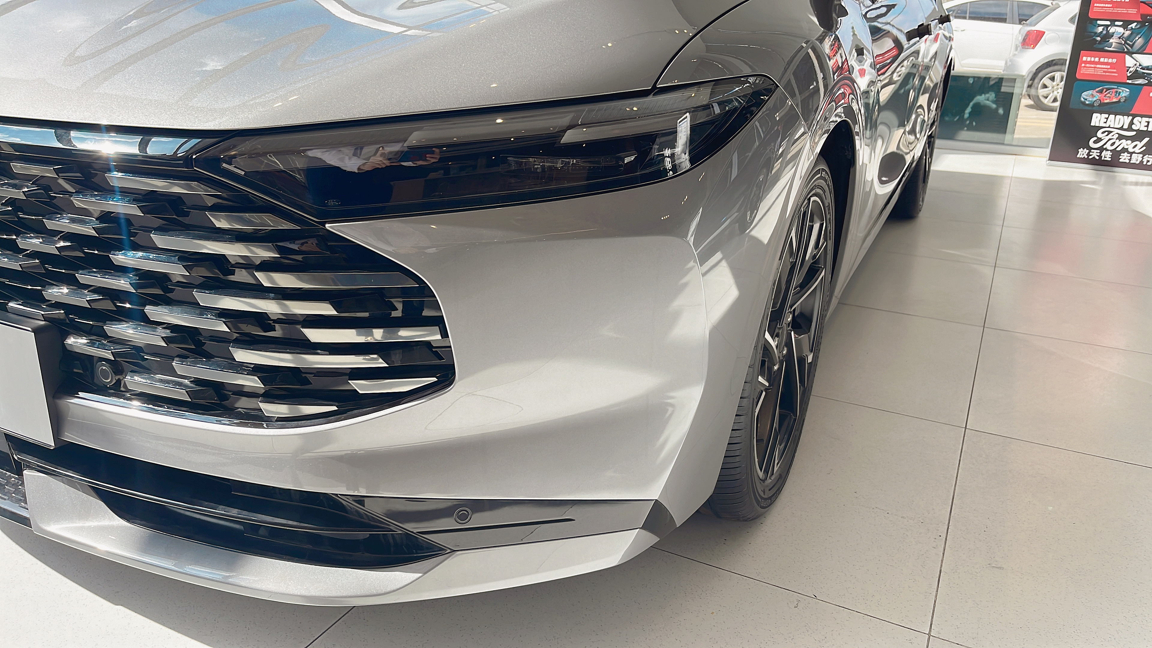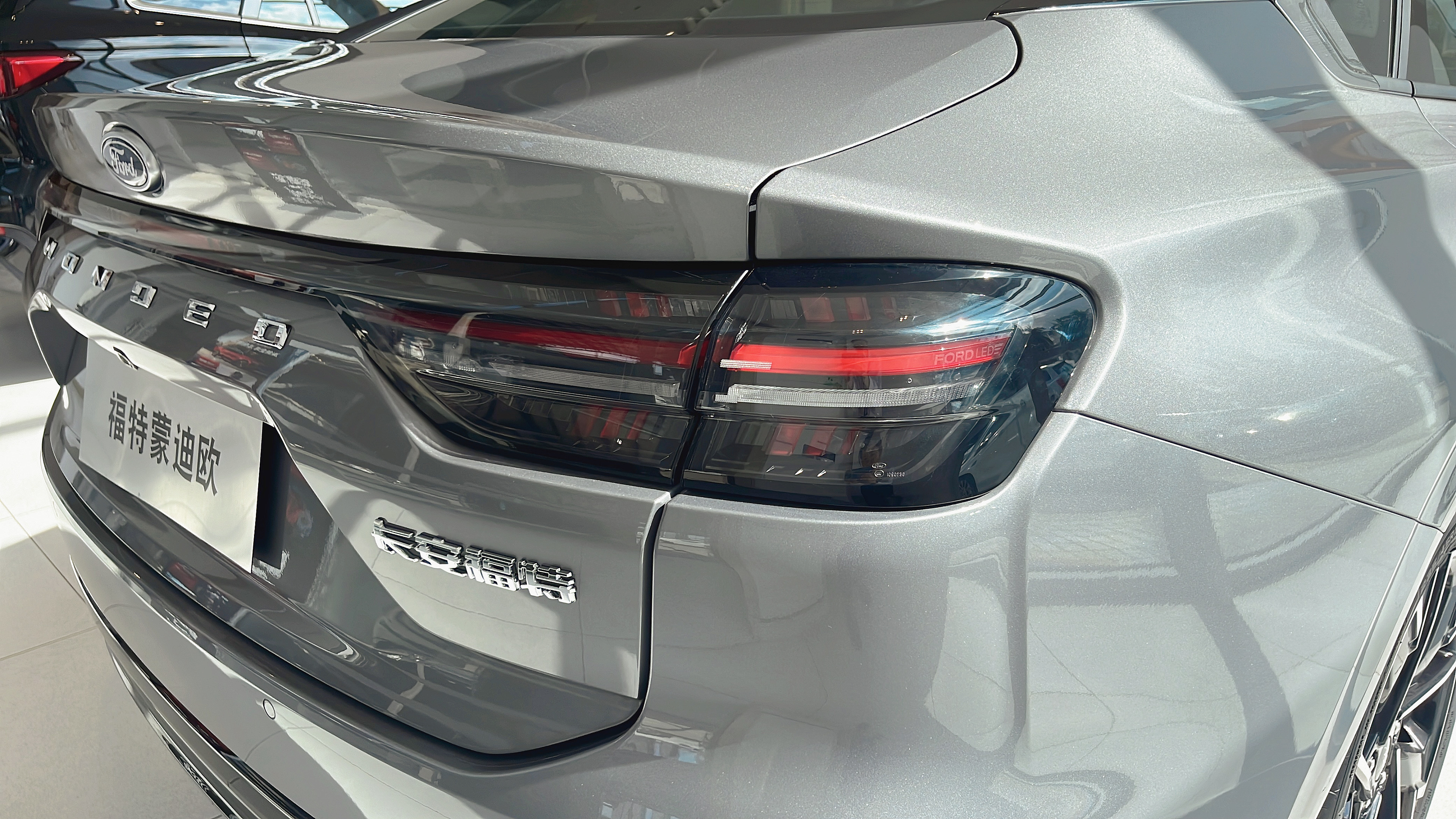 刚到店就一眼认出了展车,蒙迪欧的外观属于 "越看越舒服" 的类型。大尺寸点阵式格栅比老款的 "鳞片" 设计顺眼多了,镀铬元素排列得很规整,不会显得廉价。LED 大灯取消了分体式设计,造型紧凑又精神,销售说晚上点亮后照射范围很广,跑高速也够用。