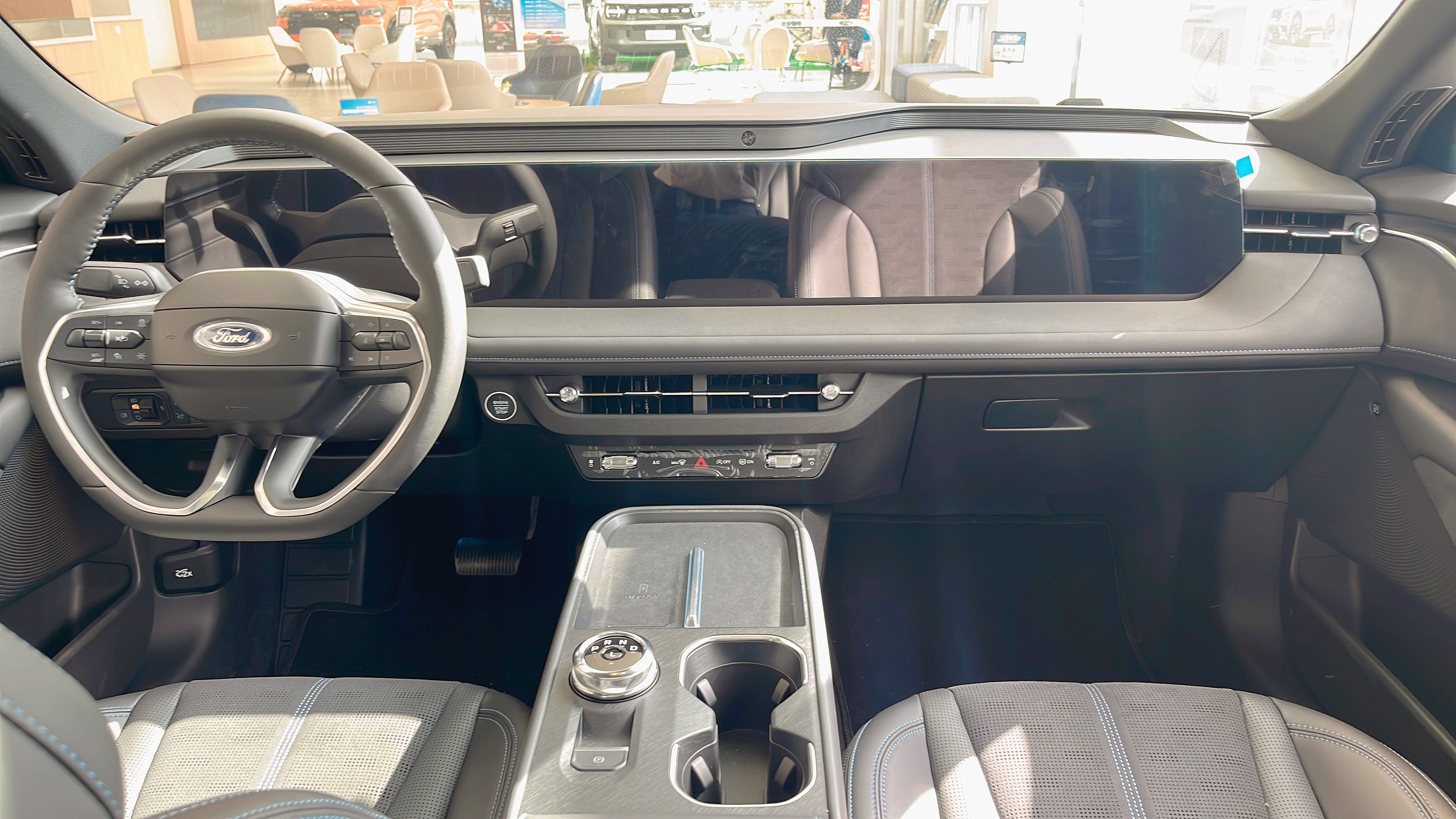 打开车门最先注意到的就是那块贯穿式大屏 ——12.3 英寸全液晶仪表 加中控带鱼屏连在一起,在合资燃油车里真是少见。点火后屏幕秒亮,没有延迟。试了下语音控制,说 "打开空调 24 度,导航去最近的超市",系统一次性识别完,用上8155芯片的蒙迪欧,车机确实顺滑,反应比我之前试的某日系车快多了。