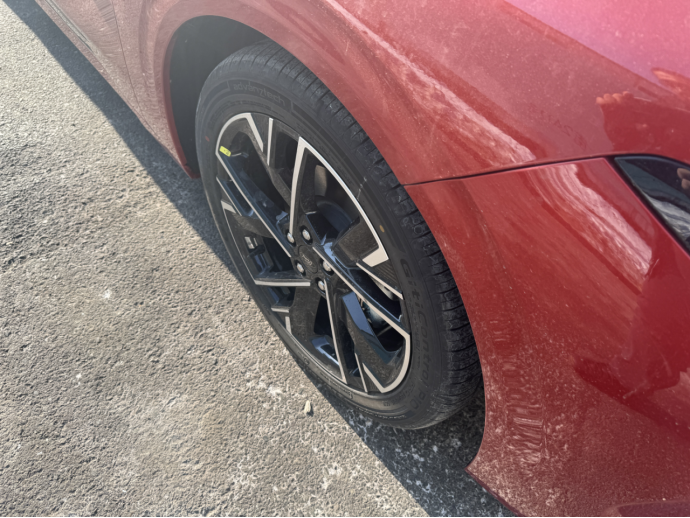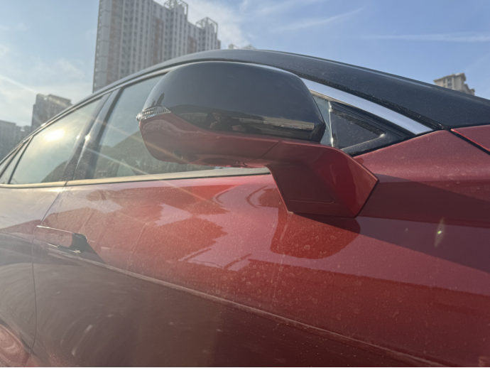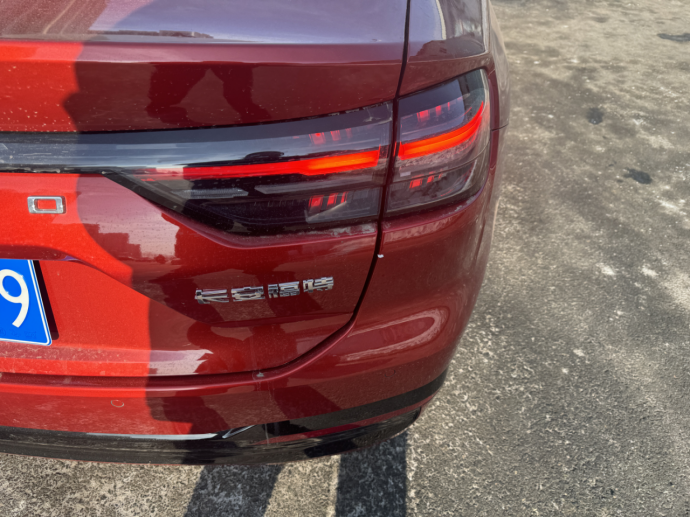 这个角度是我最喜欢的,车身侧面的线条一览无余。本来车身就有 4935mm 的长度,赤霞红的车身搭配黑色的轮毂、车窗饰条,视觉上的反差让线条更流畅,再加上溜背的弧度,车身看着更修长灵动,完全没有中型车的笨重感。