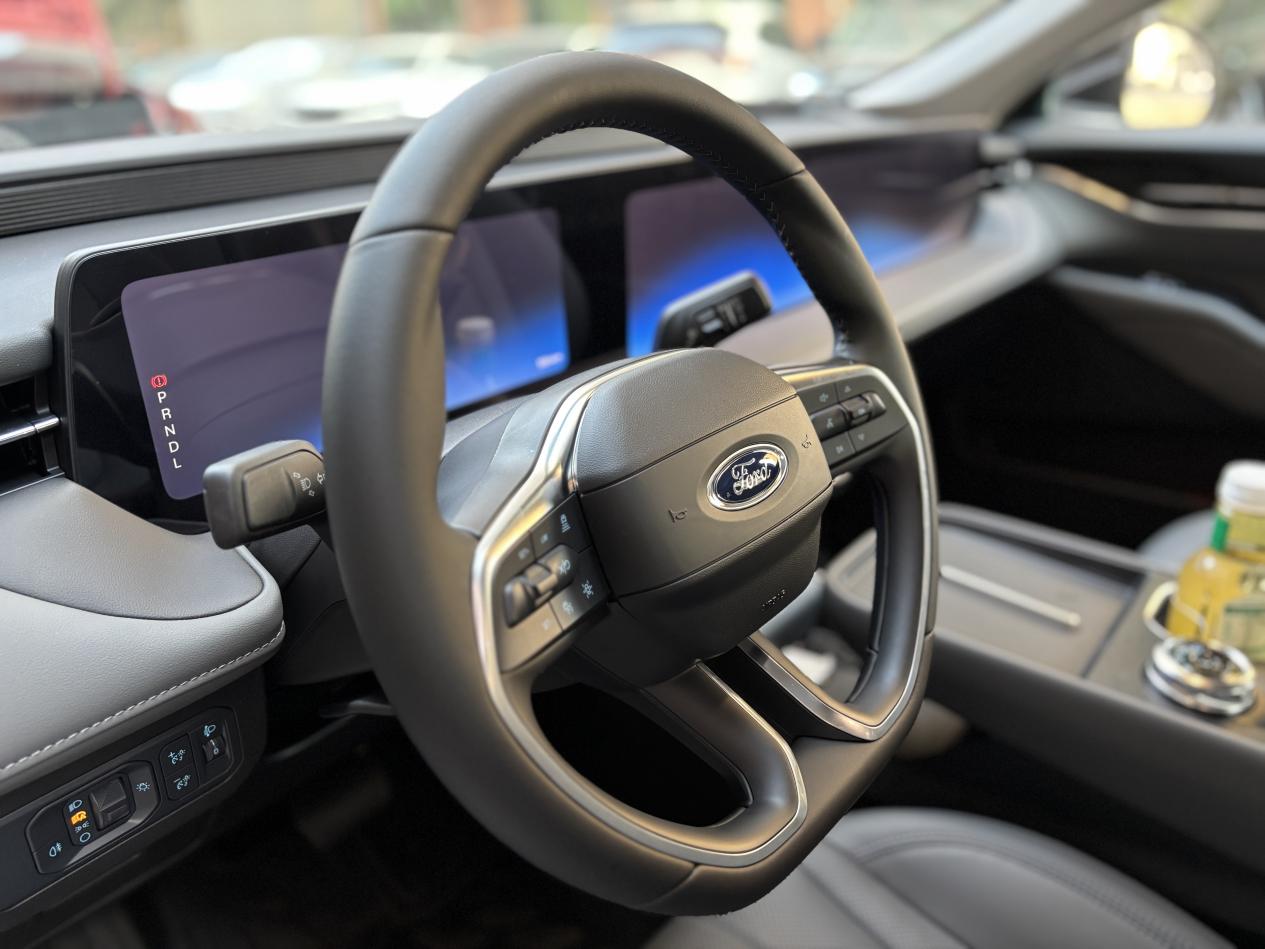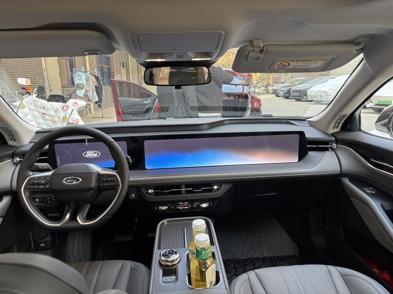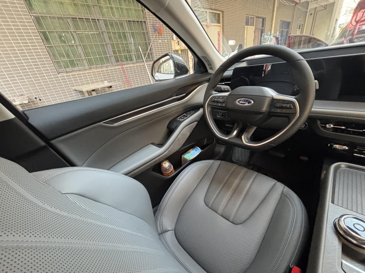 大空间要说道说道,这两周我已经帮同事搭了三次顺风车。有一个同事,180cm的身高,坐在后排腿部有两拳多的距离,完全不局促。有一次同事带了个大行李箱,本以为要放后备箱,结果后排过道都能轻松塞下,还能再放两个背包。内饰的27英寸大连屏也超好用,8155芯片,语音控制特别灵敏,开车时喊一句“你好福特,打开空调24度”,立马就能响应。