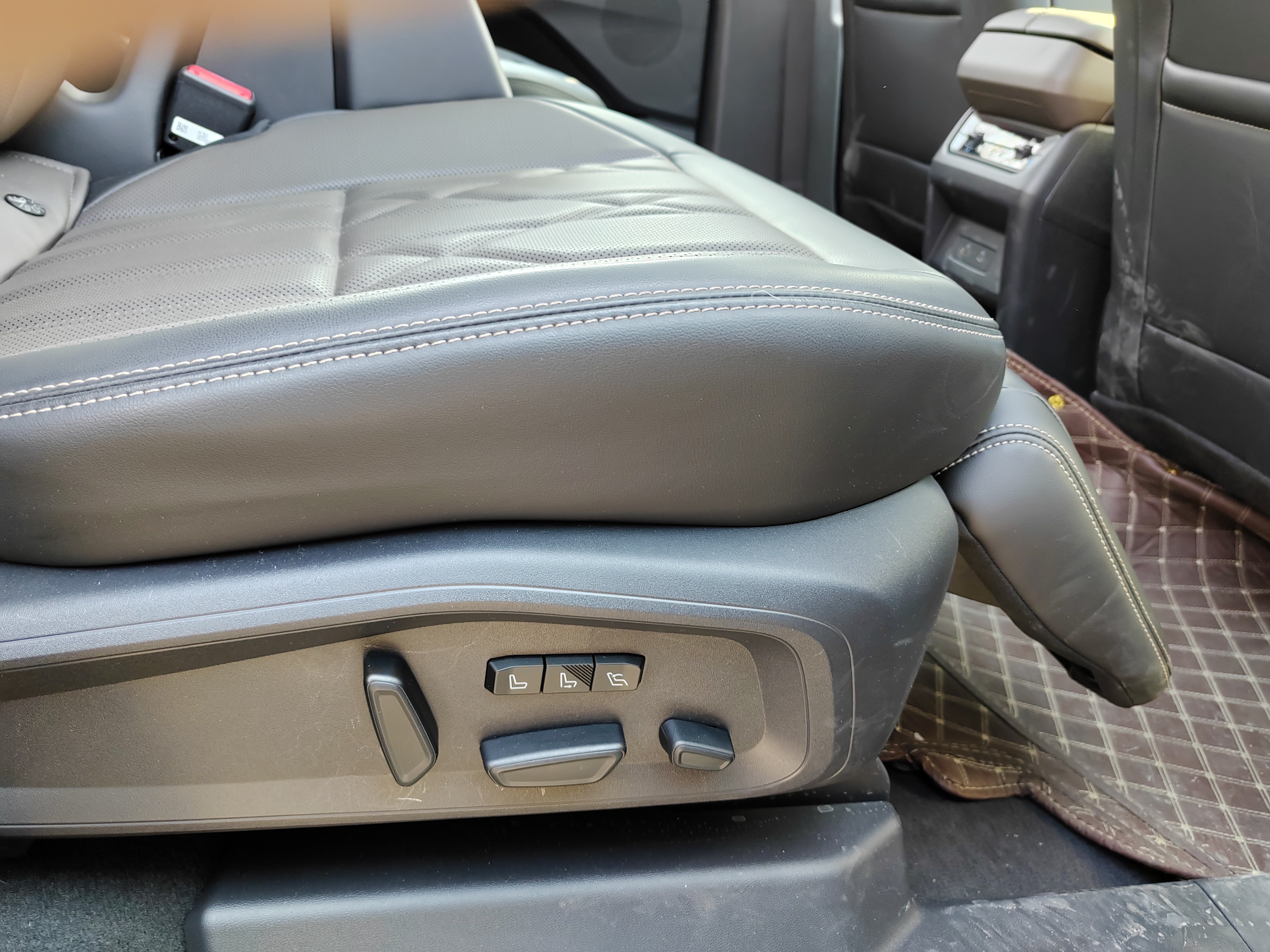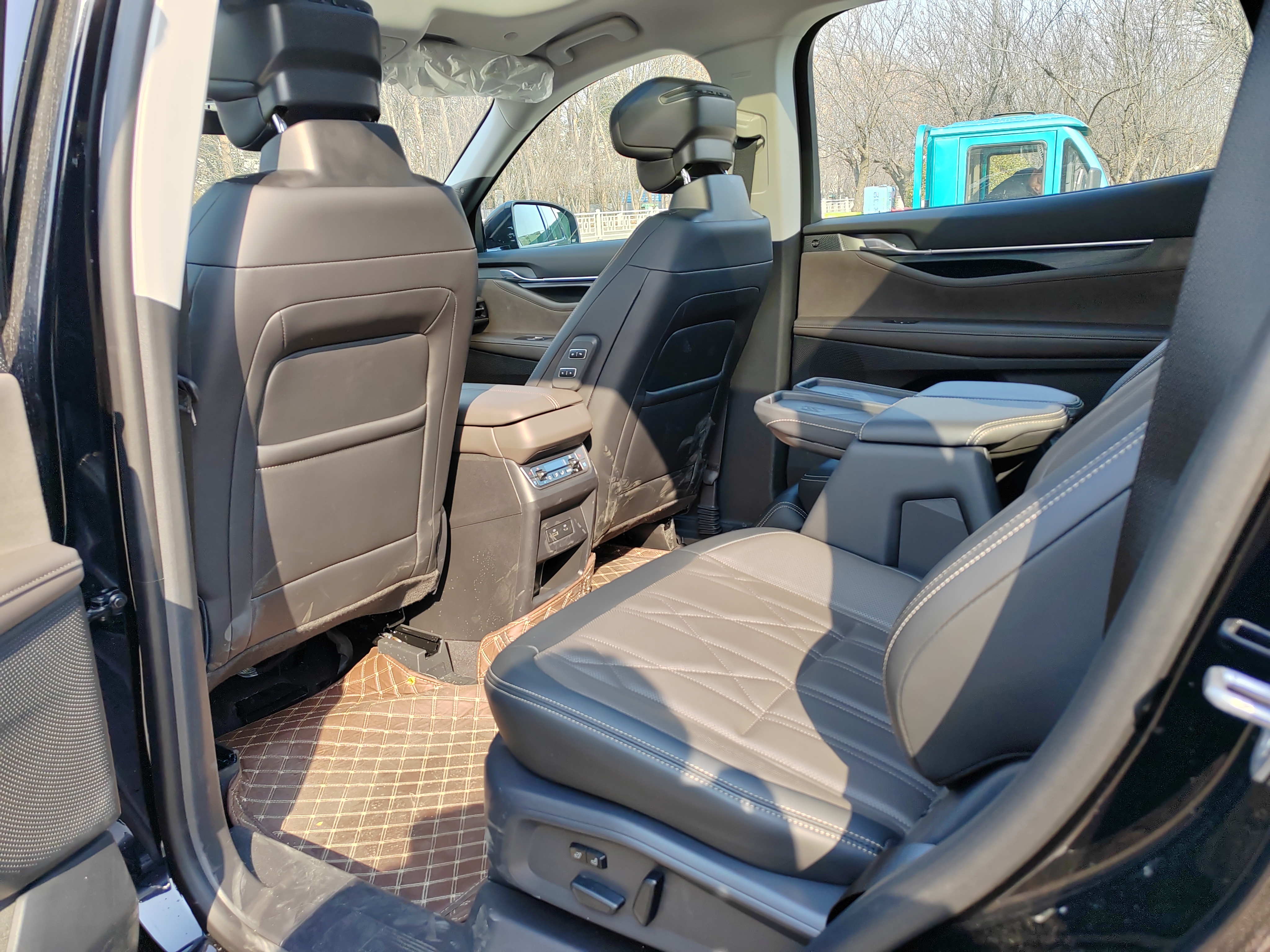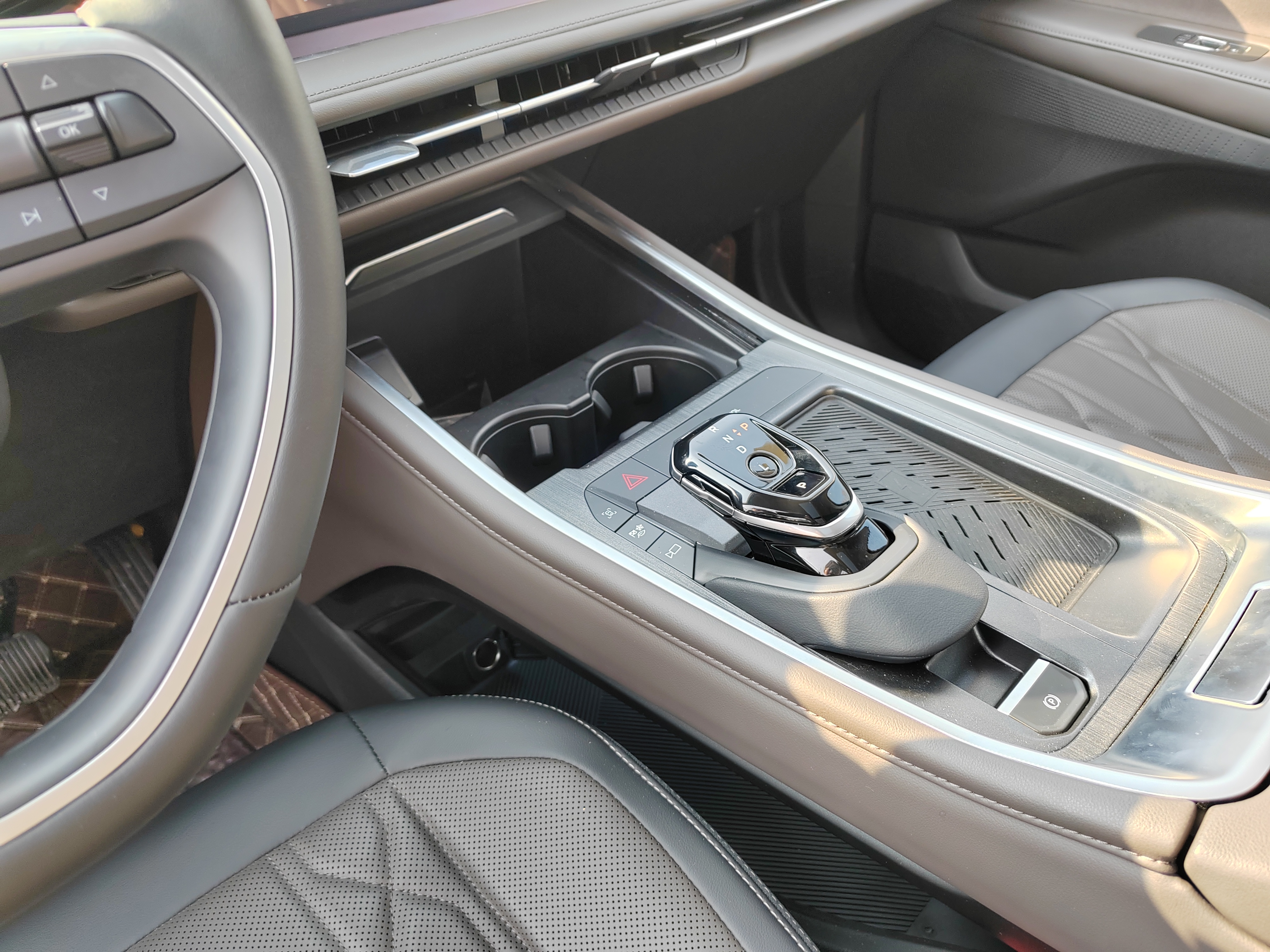车里是黑棕配的内饰,看着不亮眼,但手感不错,没啥廉价的感觉,挺扎实的。我买的是2.0T混动至尊那款,动力数据是275匹。说实话,我对数据不敏感,但开起来的感受是实打实的。提速有劲,超车的时候心里不慌,方向盘转起来也挺跟手,不像在开一个将近五米的大车,媳妇开起来也说比想象中轻松。四驱是机械的,前几天我们这边早上路上有雾气,背阴的路段还有一层薄冰,开过去的时候感觉车子抓地很稳,心里踏实不少,这个配置在冬天看来没白选。