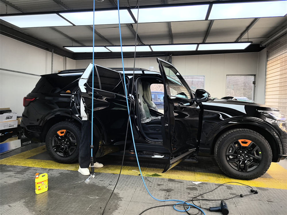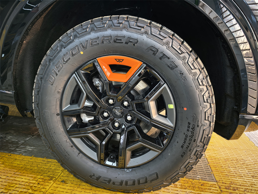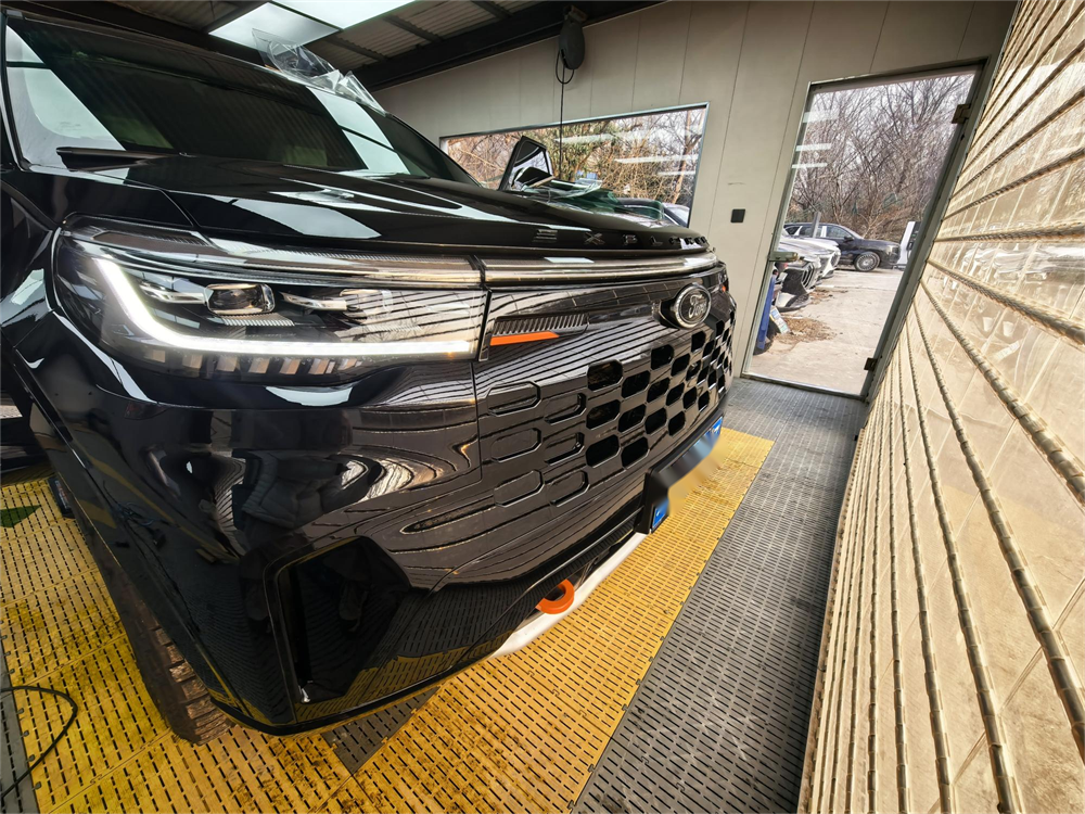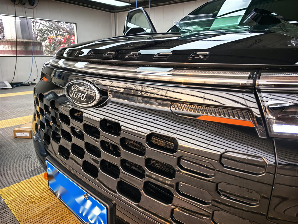 昆仑穿越版的外观比普通探险者更野一点。我选的是黑色车漆。前脸黑化的山地格栅条幅很粗,发动机和变速箱还加了金属护板,拖车钩是橙色的,在黑色车身上特别显眼。轮胎是原厂标配的AT全地形胎,站姿很稳,不像一般城市SUV那么秀气。