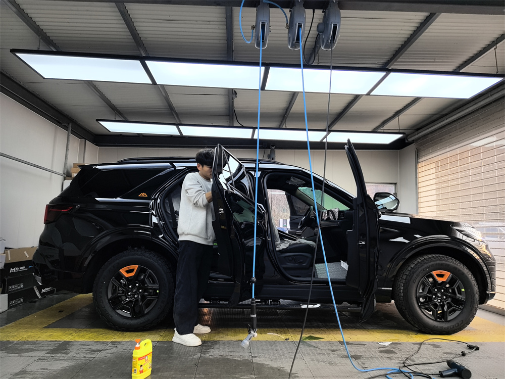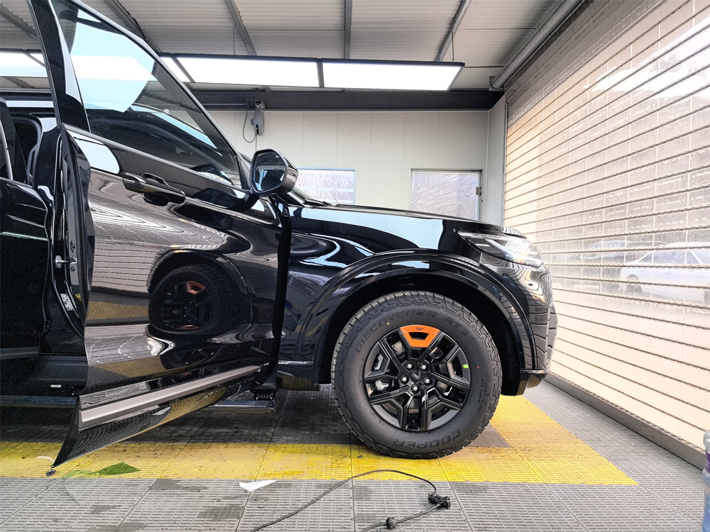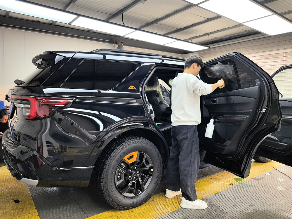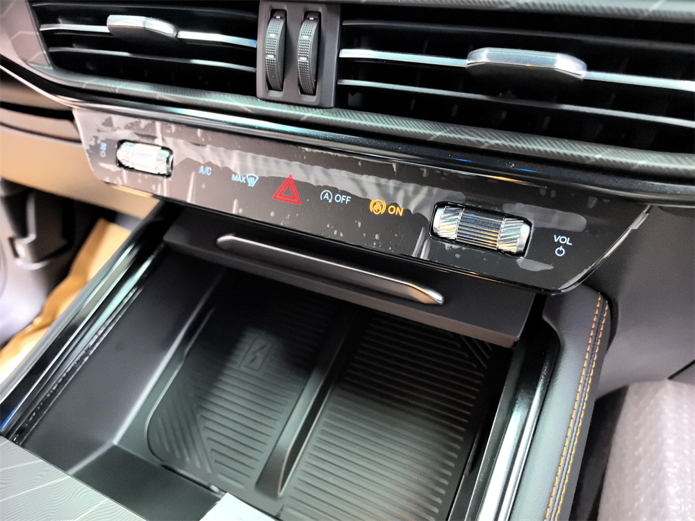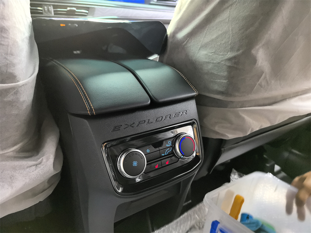 昆仑穿越版的外观比普通探险者更野一点。我选的是黑色车漆。前脸黑化的山地格栅条幅很粗,发动机和变速箱还加了金属护板,拖车钩是橙色的,在黑色车身上特别显眼。轮胎是原厂标配的AT全地形胎,站姿很稳,不像一般城市SUV那么秀气。