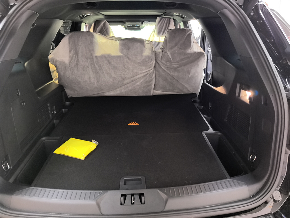 这台车后备箱常规状态是1505升,第二排放倒后直接变成2500升。我身高1米78,躺进去腿能伸直。地板是纯平的,铺个充气垫就是床。底下还有一个100升的隐藏储物格,我把拖车绳、急救包、工具都放进去,盖上盖板,后备箱干干净净。