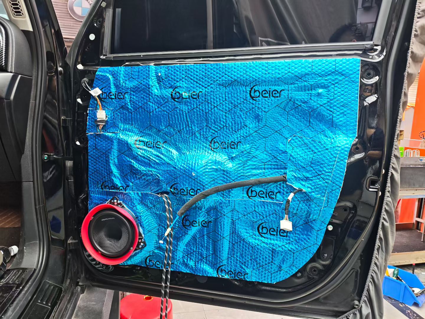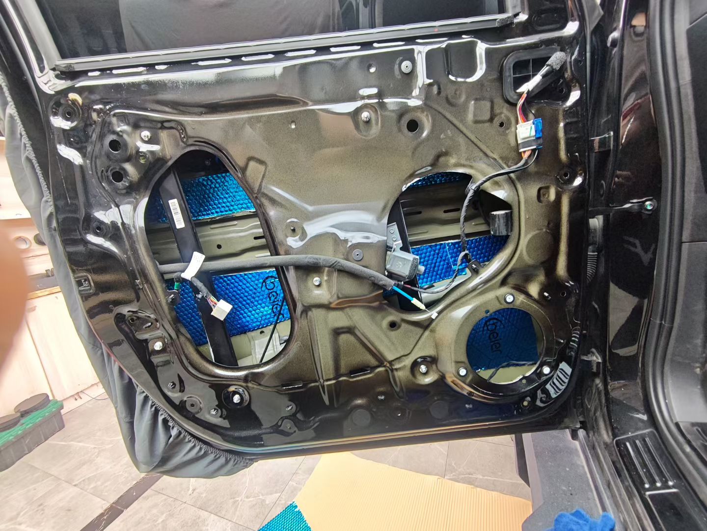 原车门板的铁皮比较单薄,动态稍微大点就会共震,现在第一步就是让师傅帮忙贴个隔音加厚铁皮避免共震