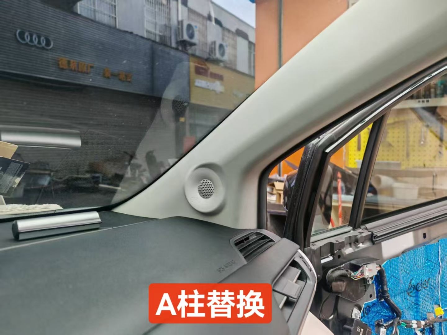 在A柱旁边个喇叭位置,空间挺大能安装中音,这就是赛那优势的点,不用倒模就能安装三分频喇叭